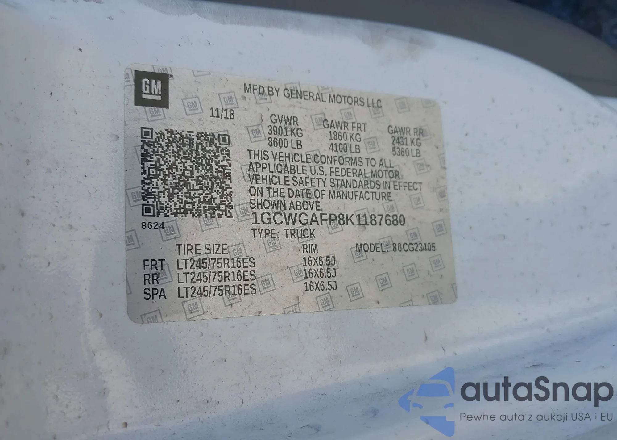• VIN 1GCWGAFP8K1187680