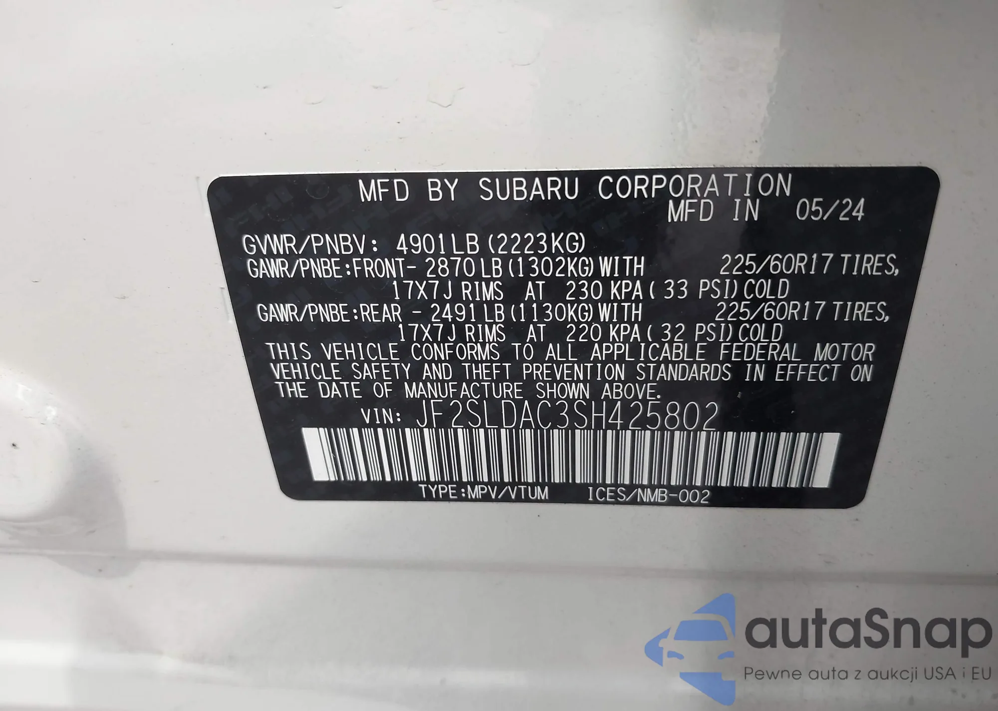 LOT: 43370873 VIN: JF2SLDAC3SH425802