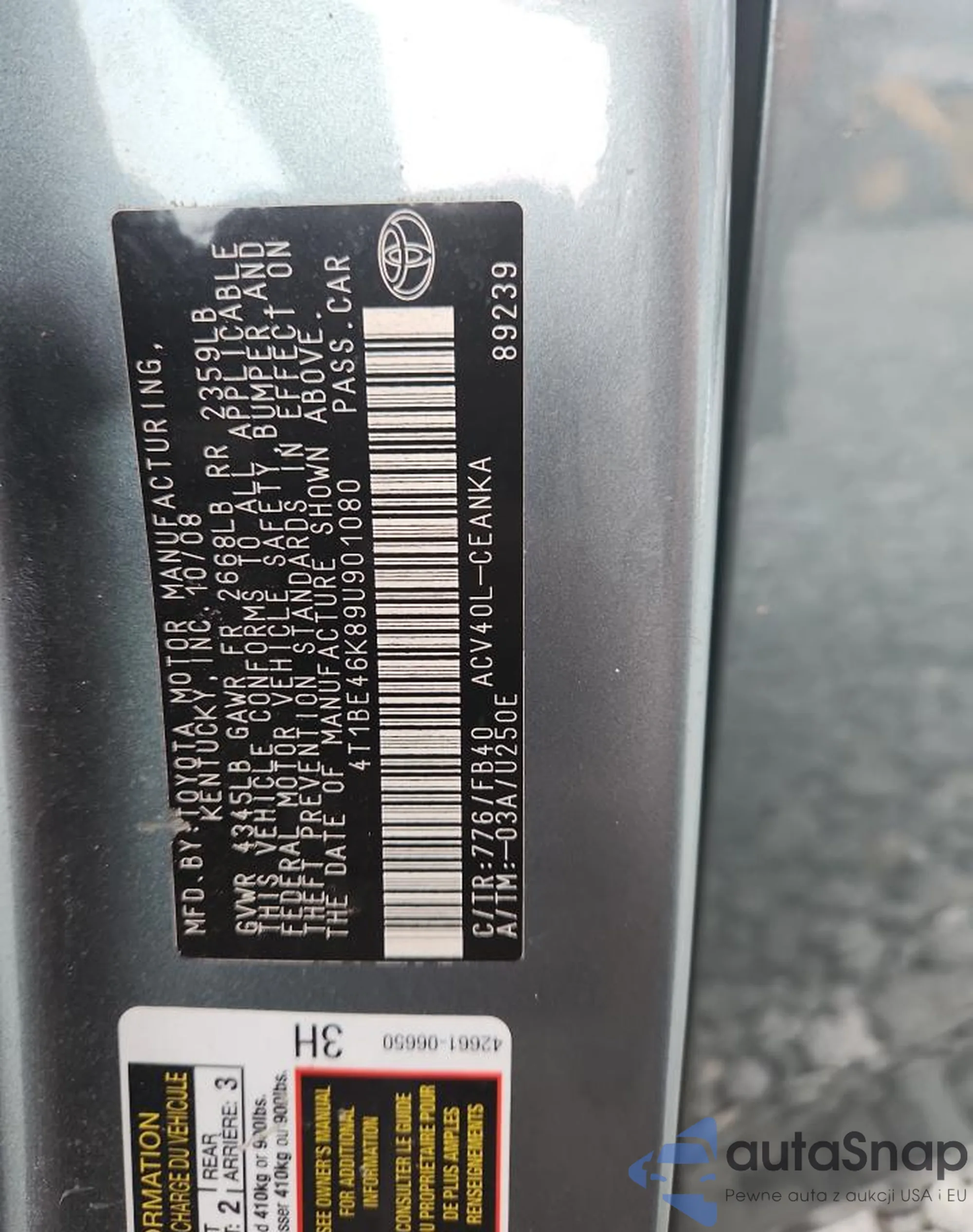 • VIN 4T1BE46K89U901080