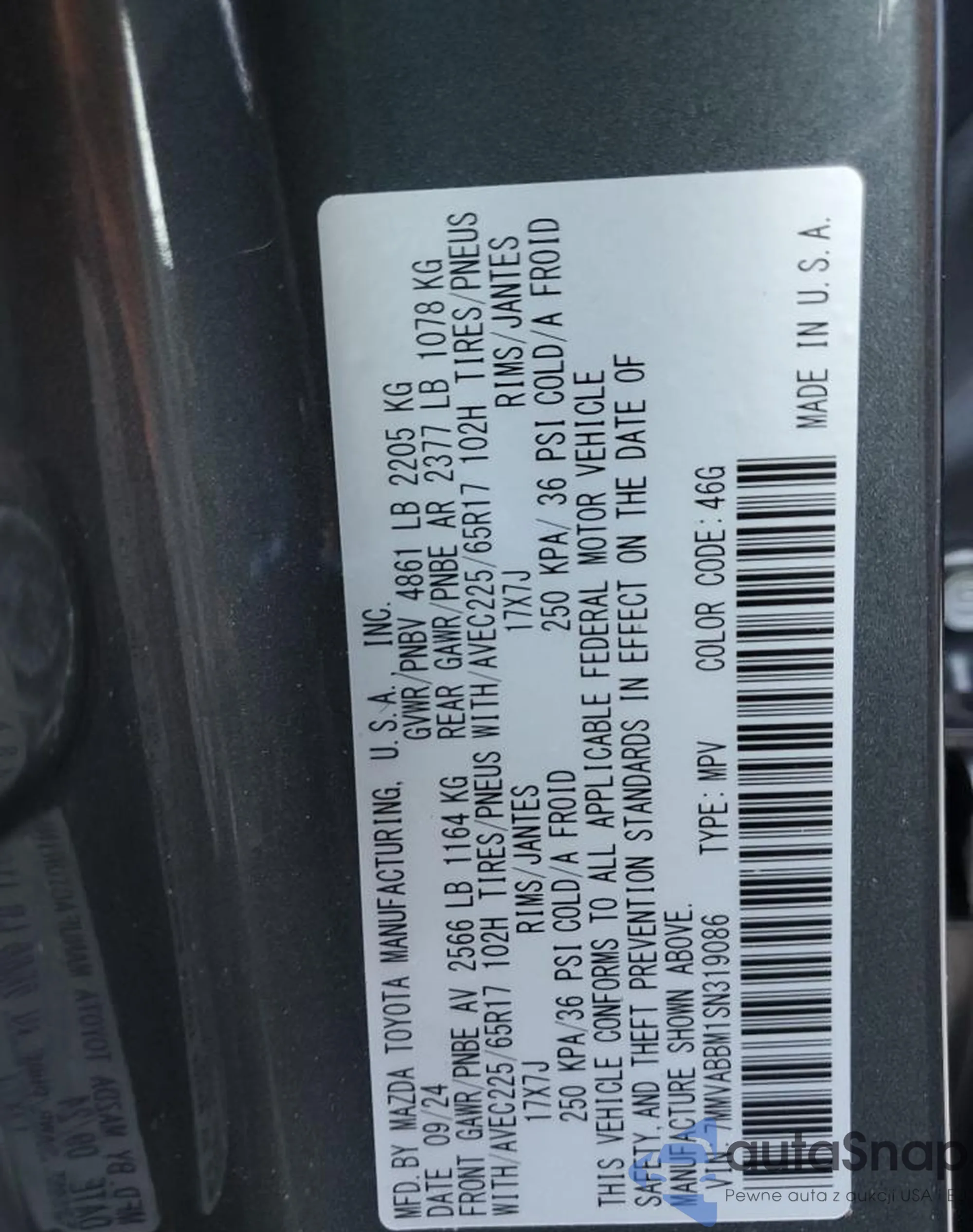 • VIN 7MMVABBM1SN319086