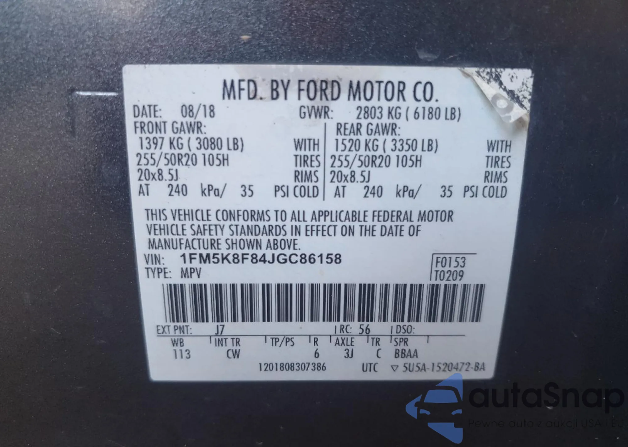 LOT: 81842015 VIN: 1FM5K8F84JGC86158