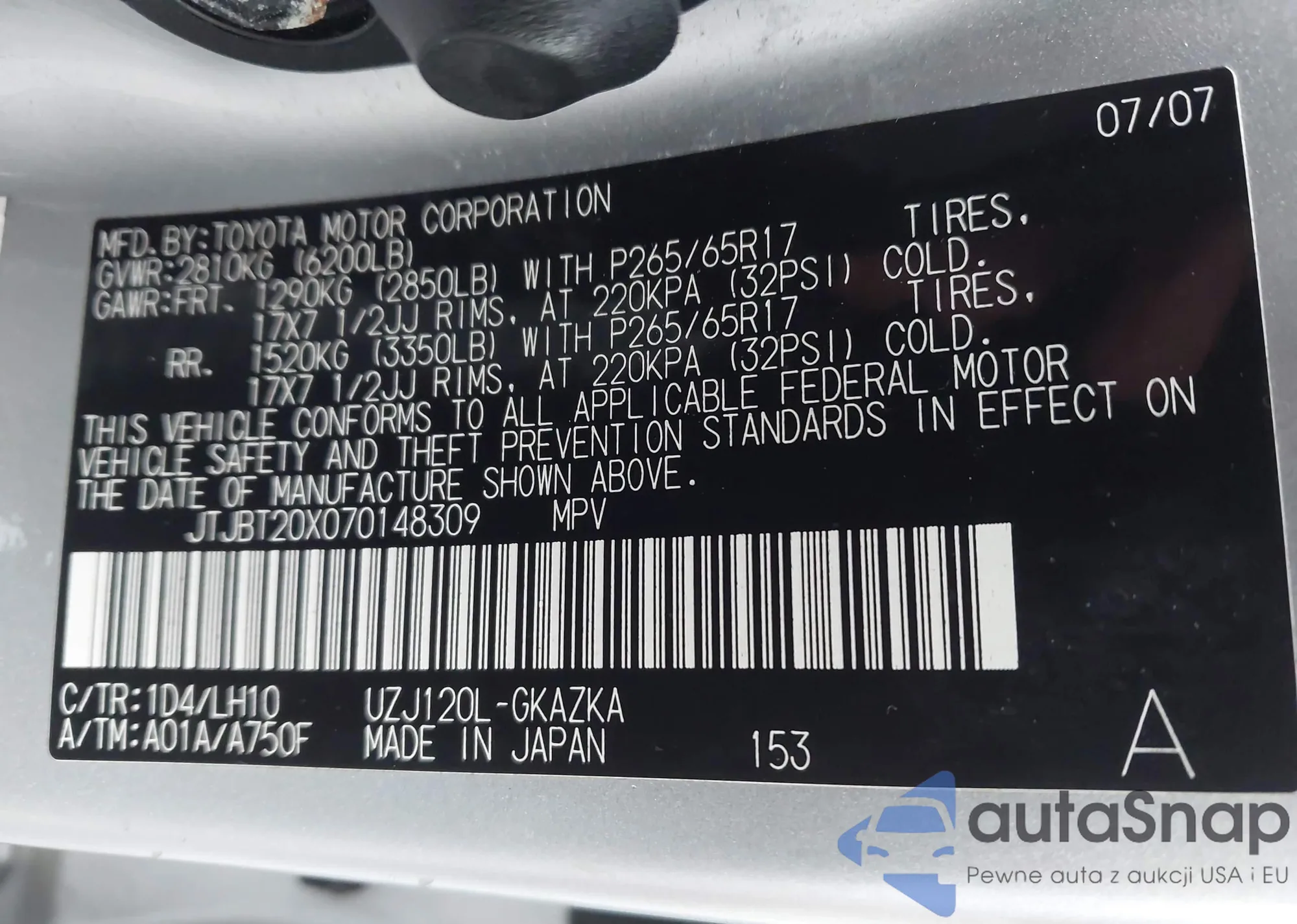 LOT: 43395788 VIN: JTJBT20X070148309
