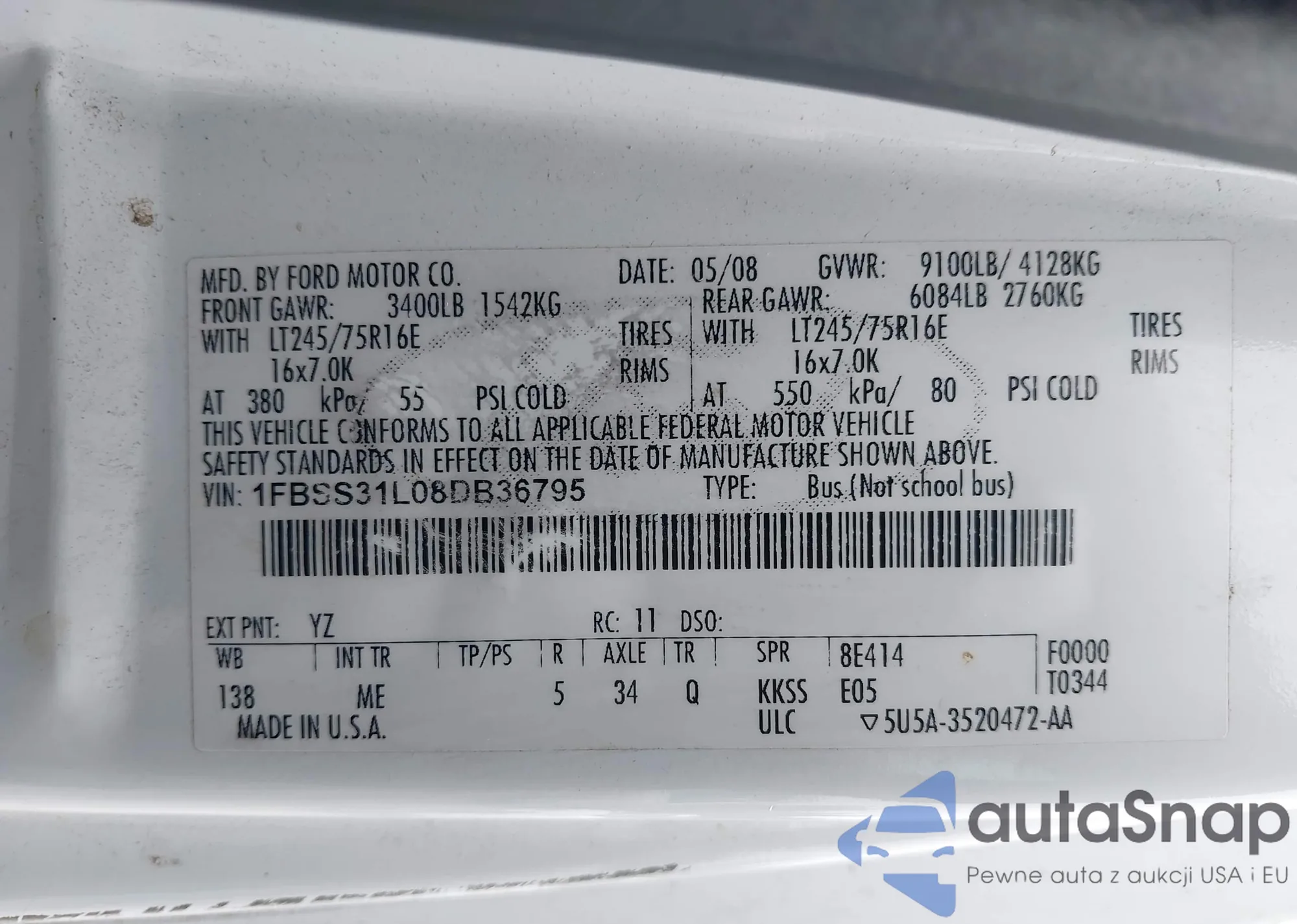 LOT: 43326562 VIN: 1FBSS31L08DB36795