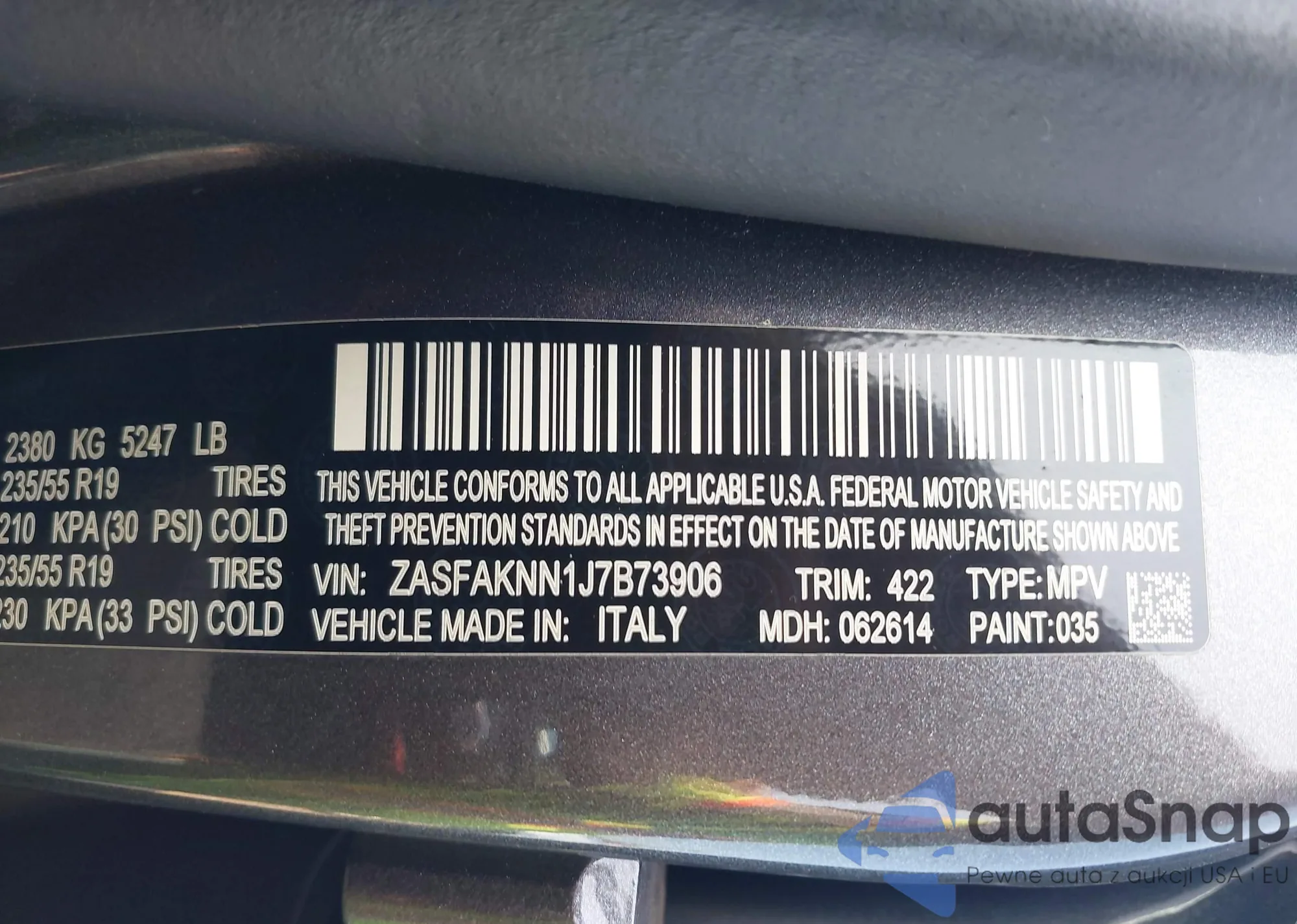 LOT: 42883159 VIN: ZASFAKNN1J7B73906
