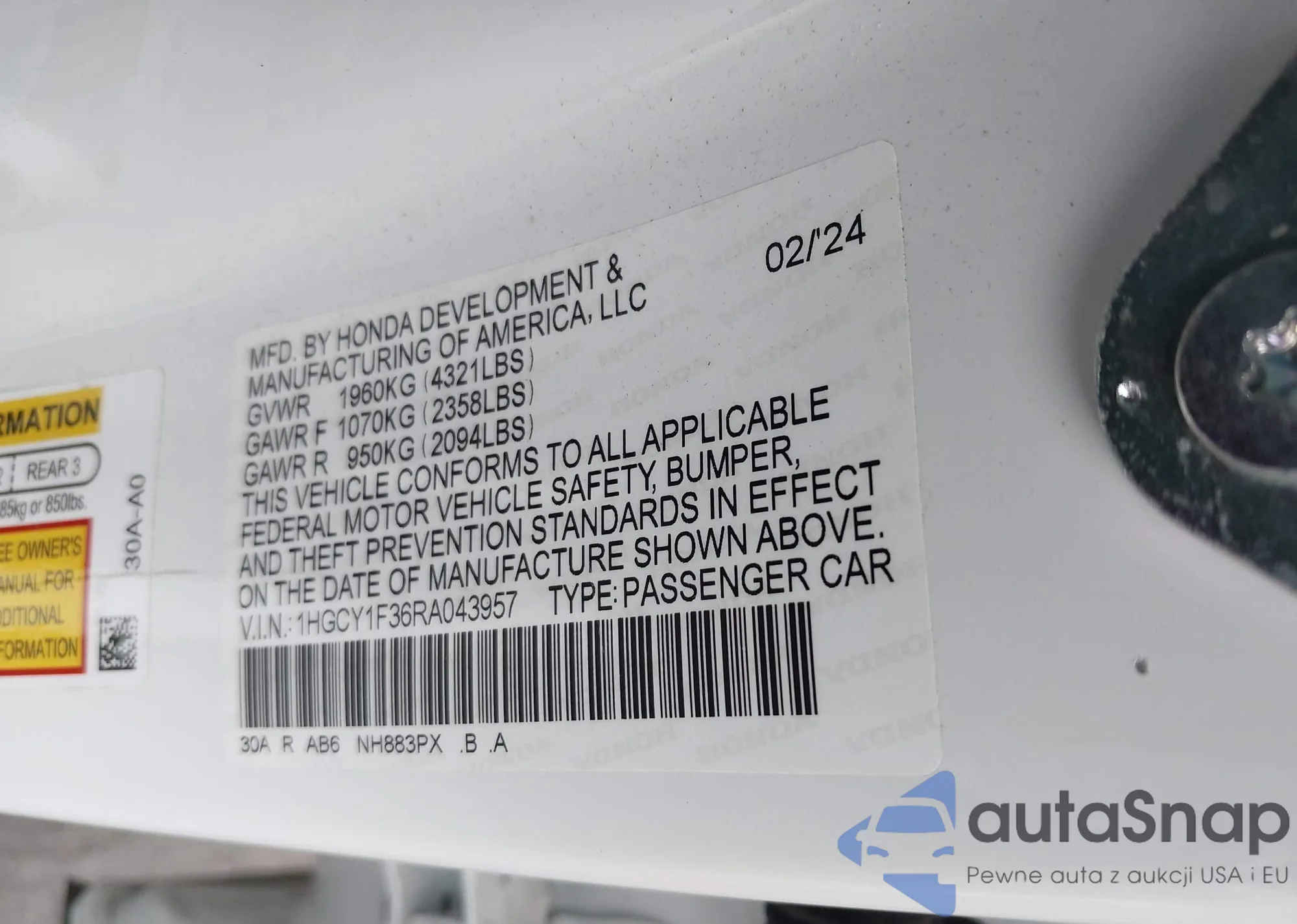 LOT: 42922211 VIN: 1HGCY1F36RA043957
