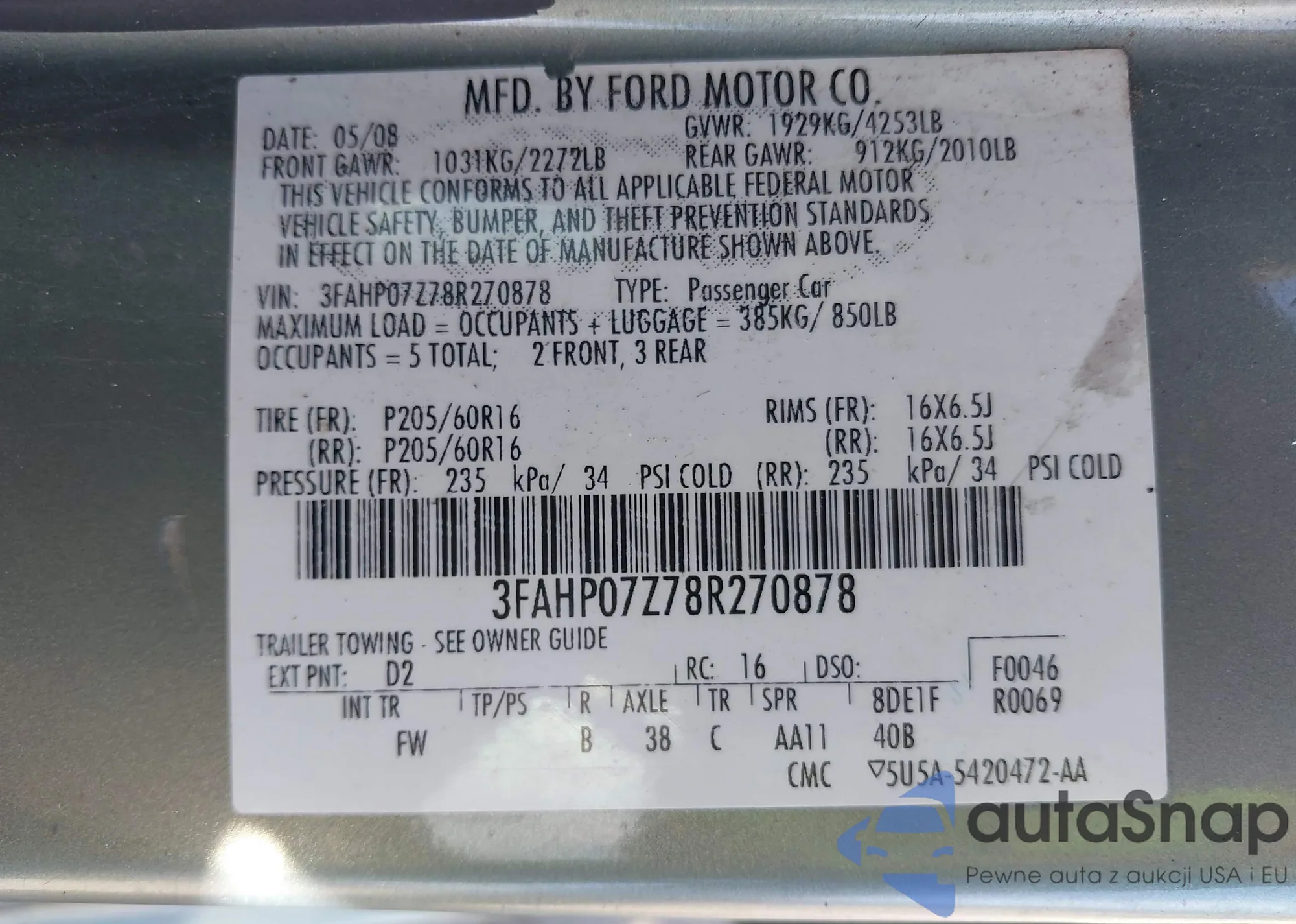 • VIN 3FAHP07Z78R270878