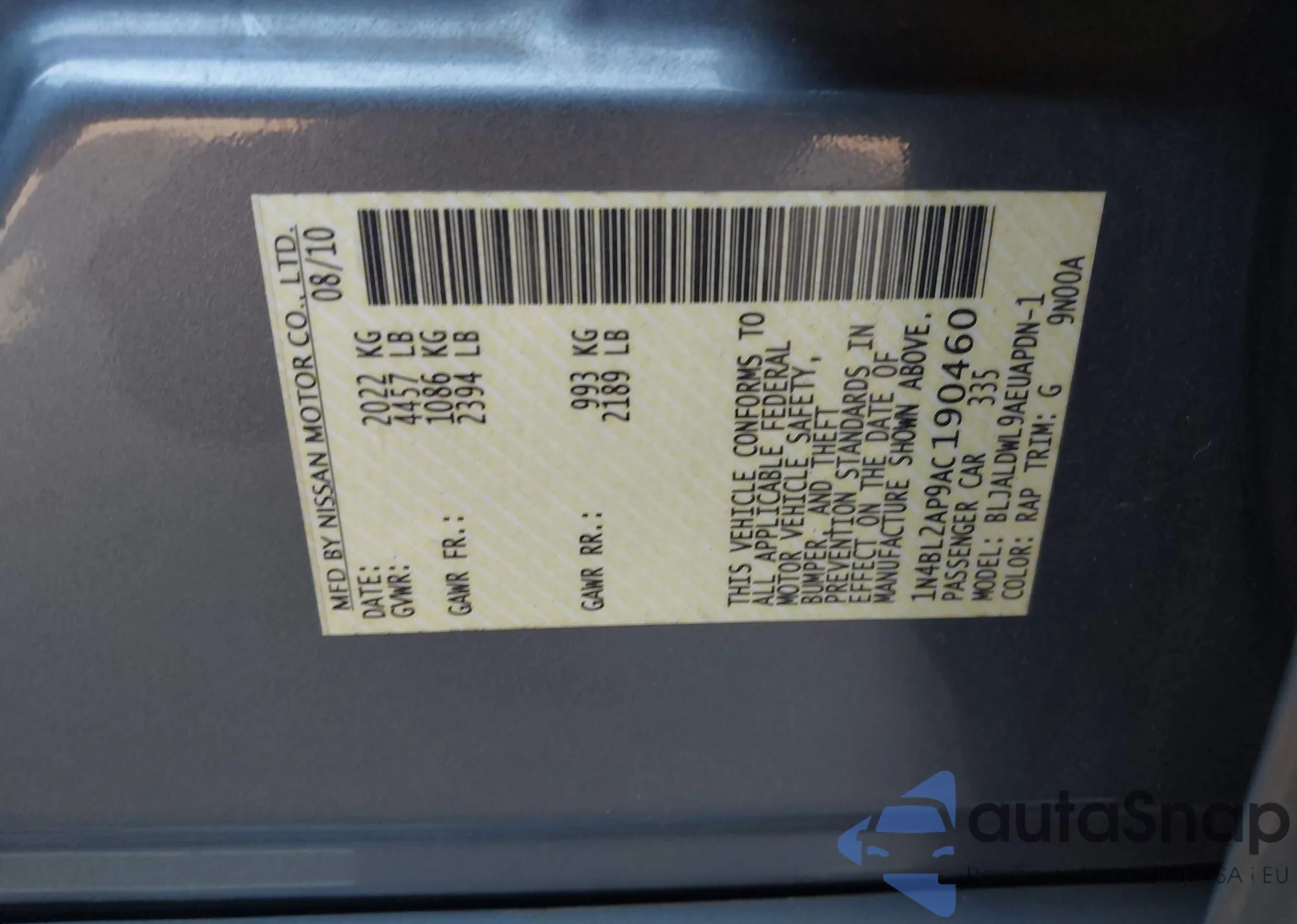 LOT: 43208546 VIN: 1N4BL2AP9AC190460