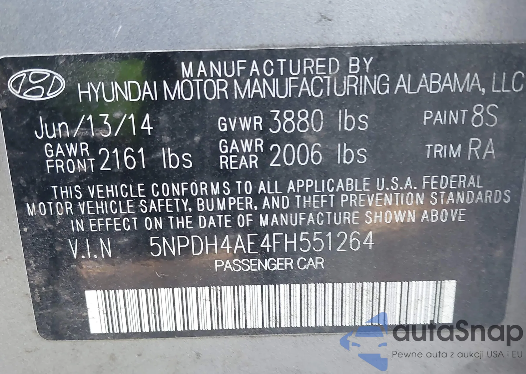 LOT: 43300228 VIN: 5NPDH4AE4FH551264