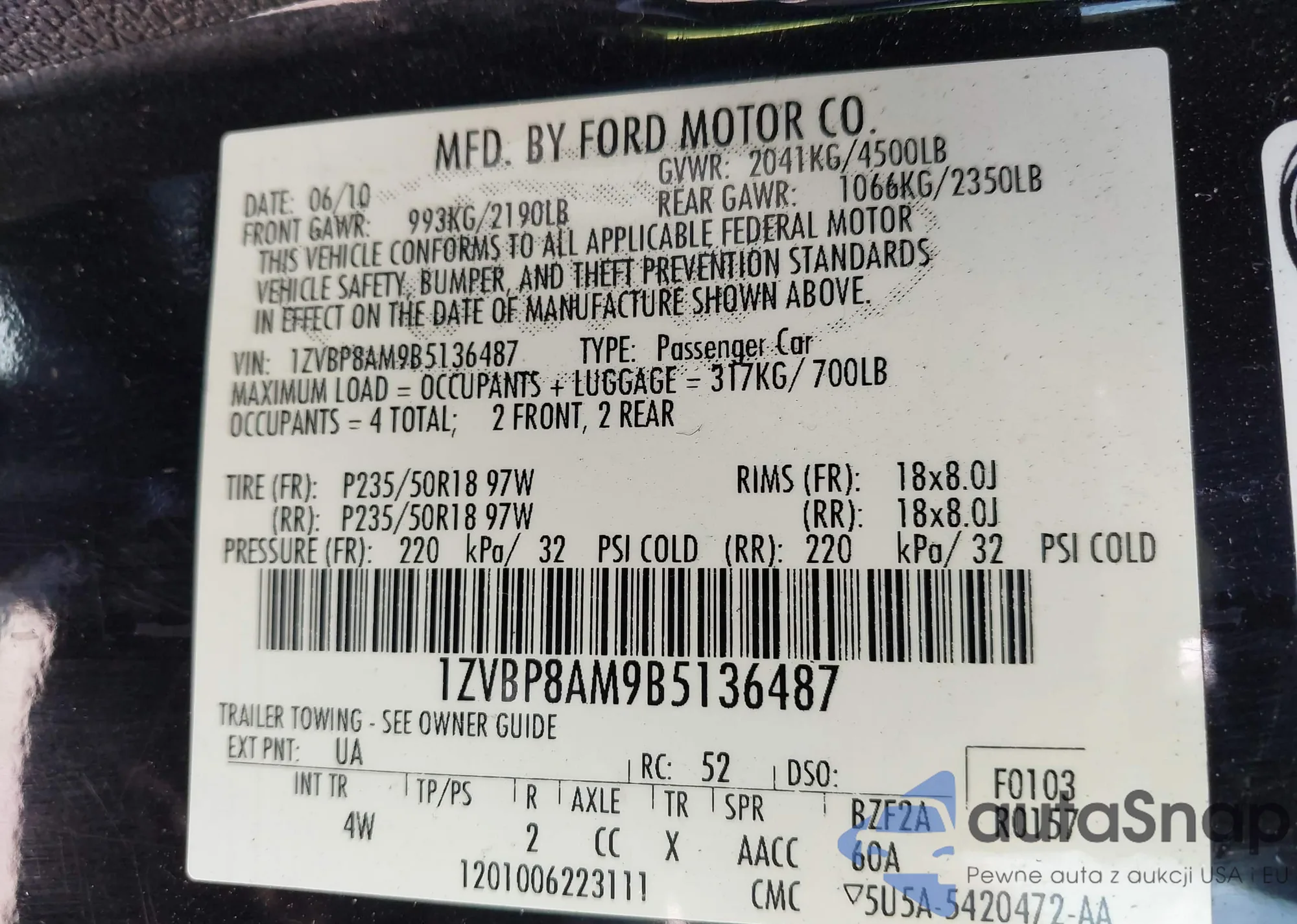 LOT: 43030070 VIN: 1ZVBP8AM9B5136487