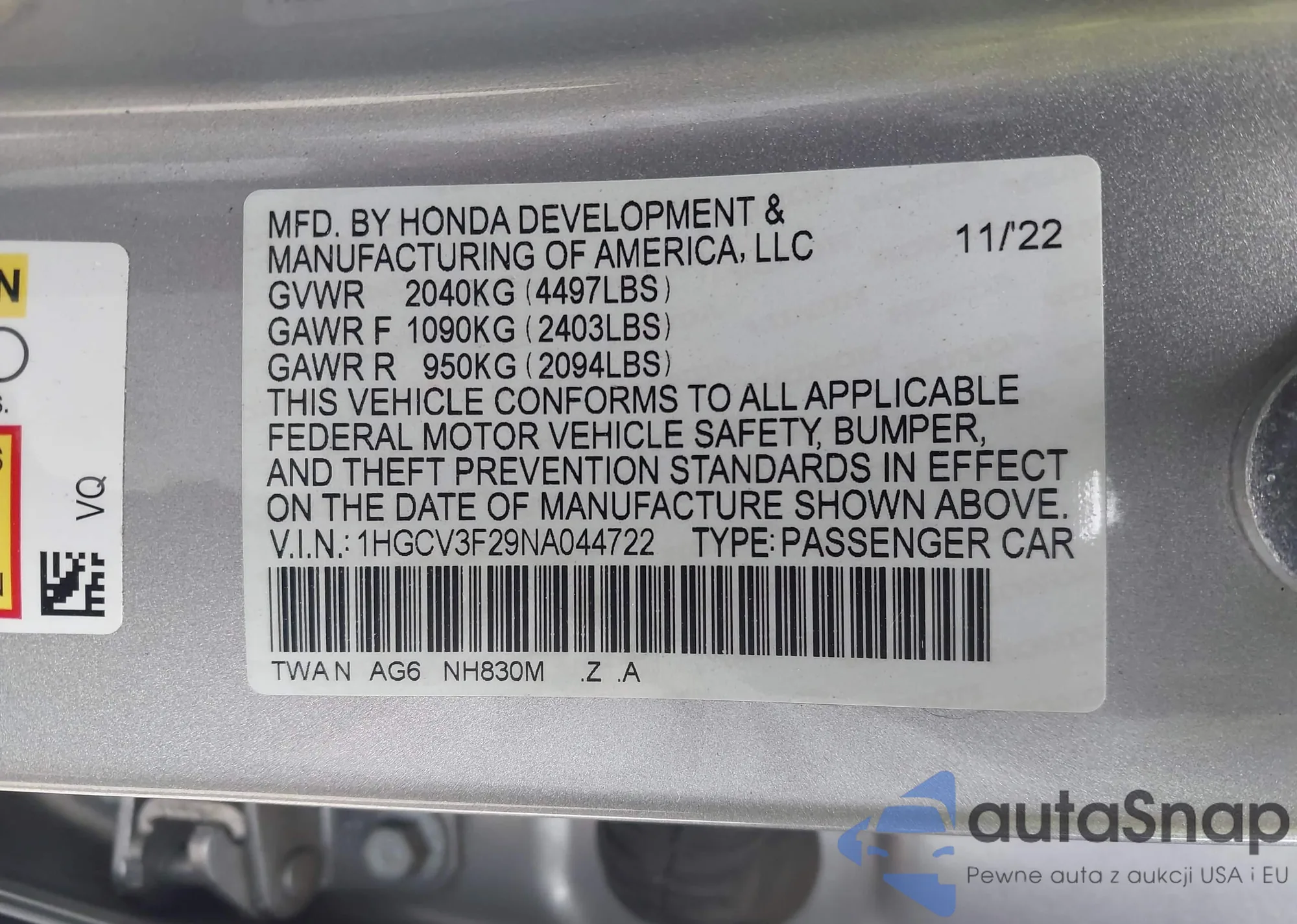 LOT: 43389139 VIN: 1HGCR2F37HA169147