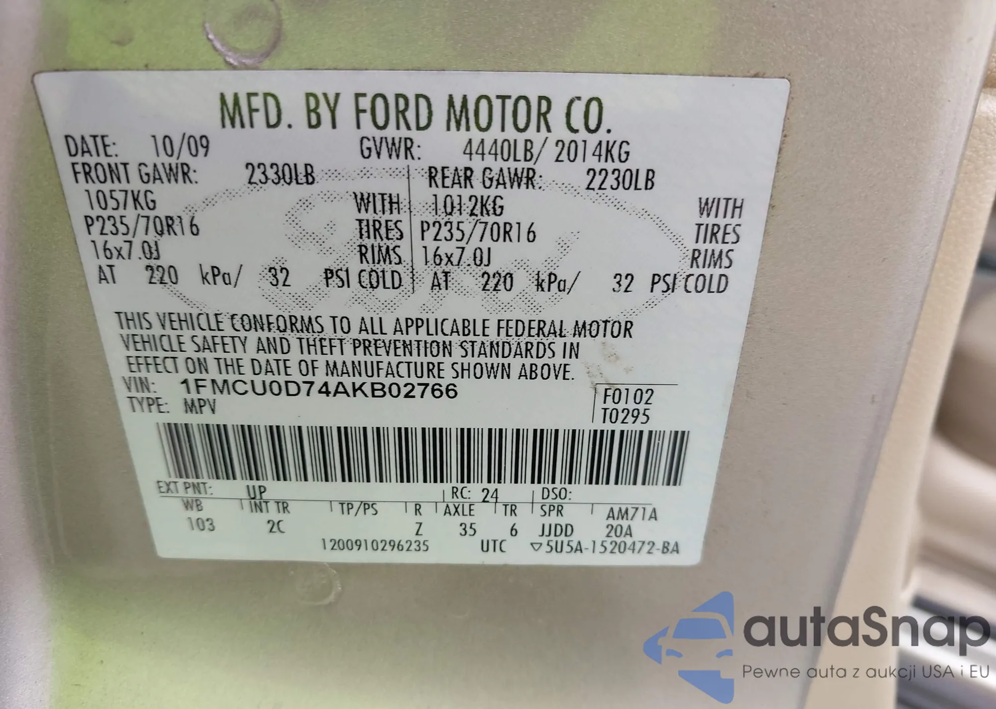 LOT: 43189140 VIN: 1FMCU0D74AKB02766