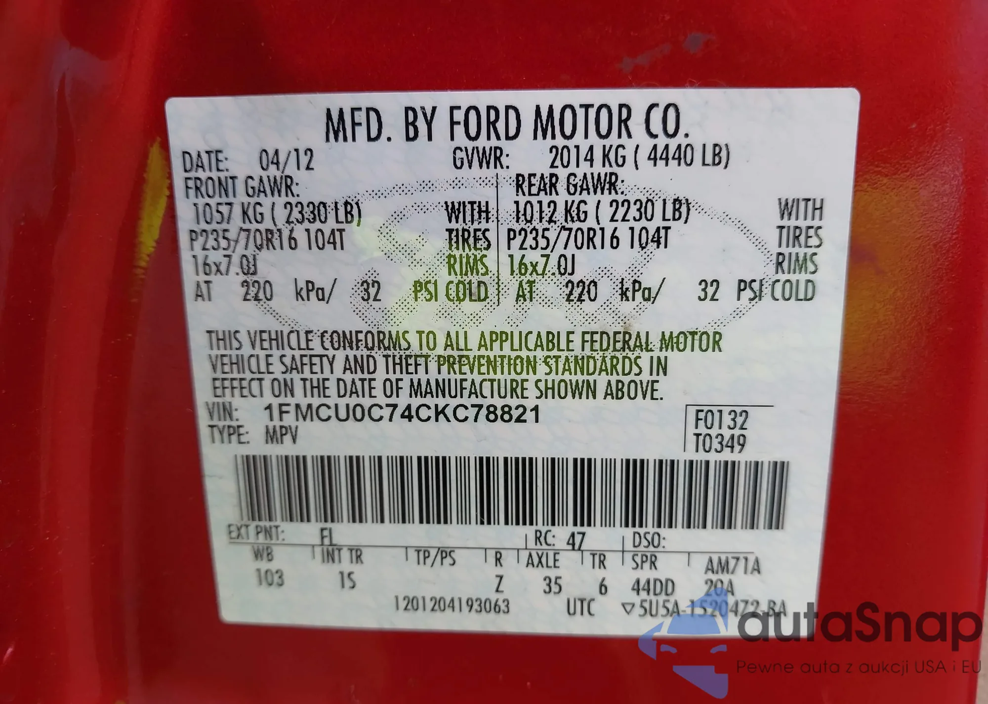 • VIN 1FMCU0C74CKC78821