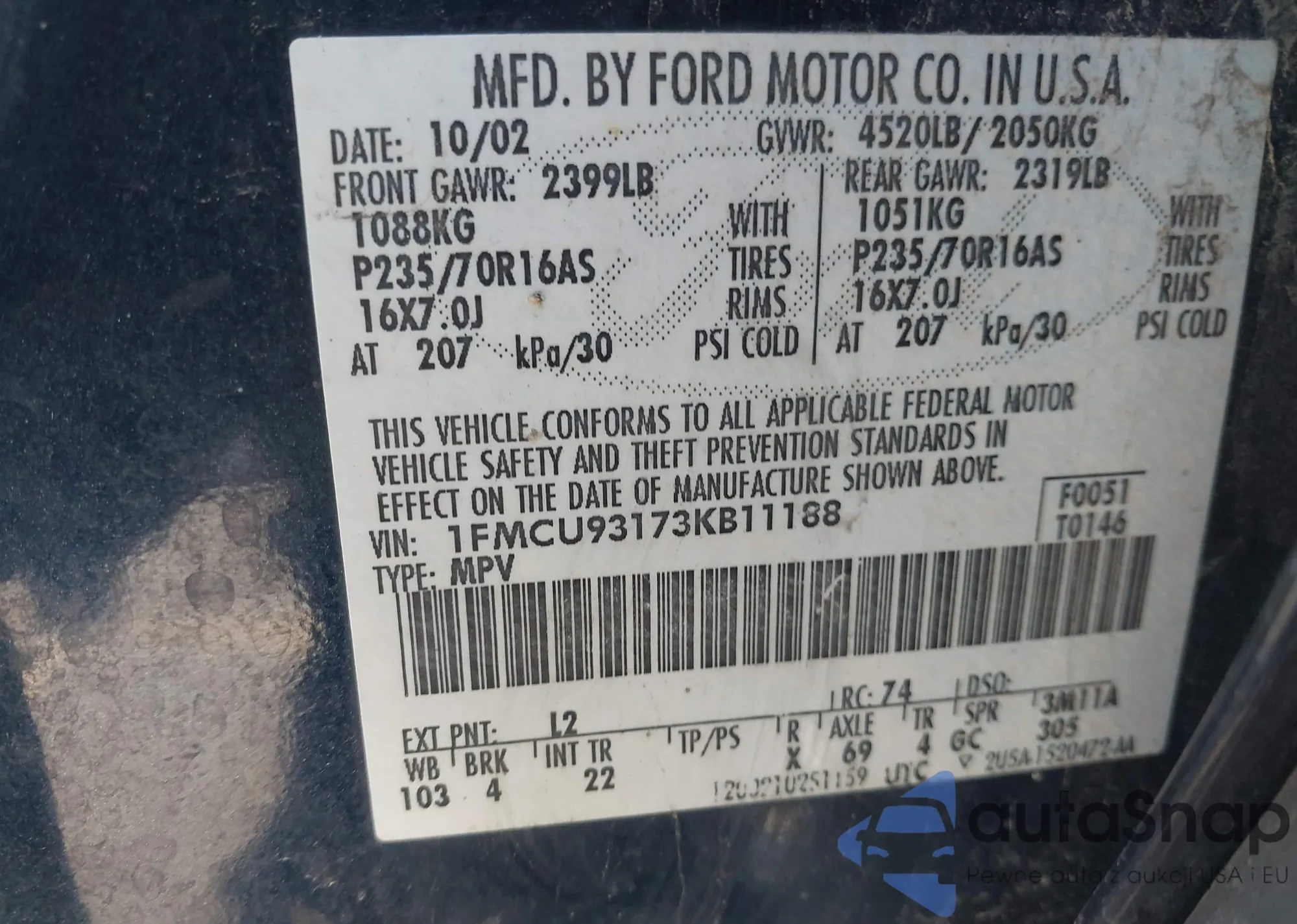 LOT: 41139594 VIN: 1FMCU93173KB11188