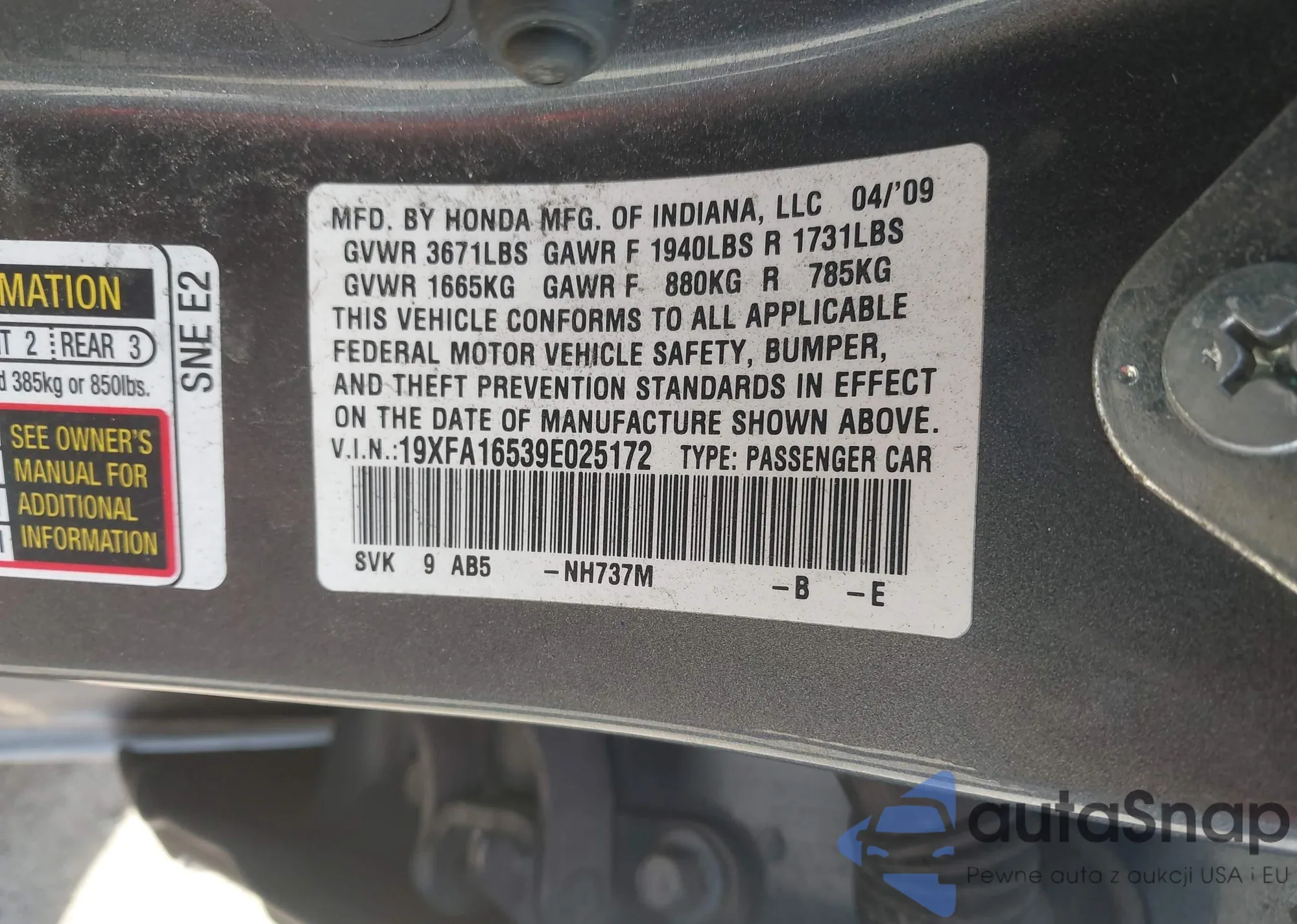 LOT: 43208449 VIN: 19XFA16949E012188