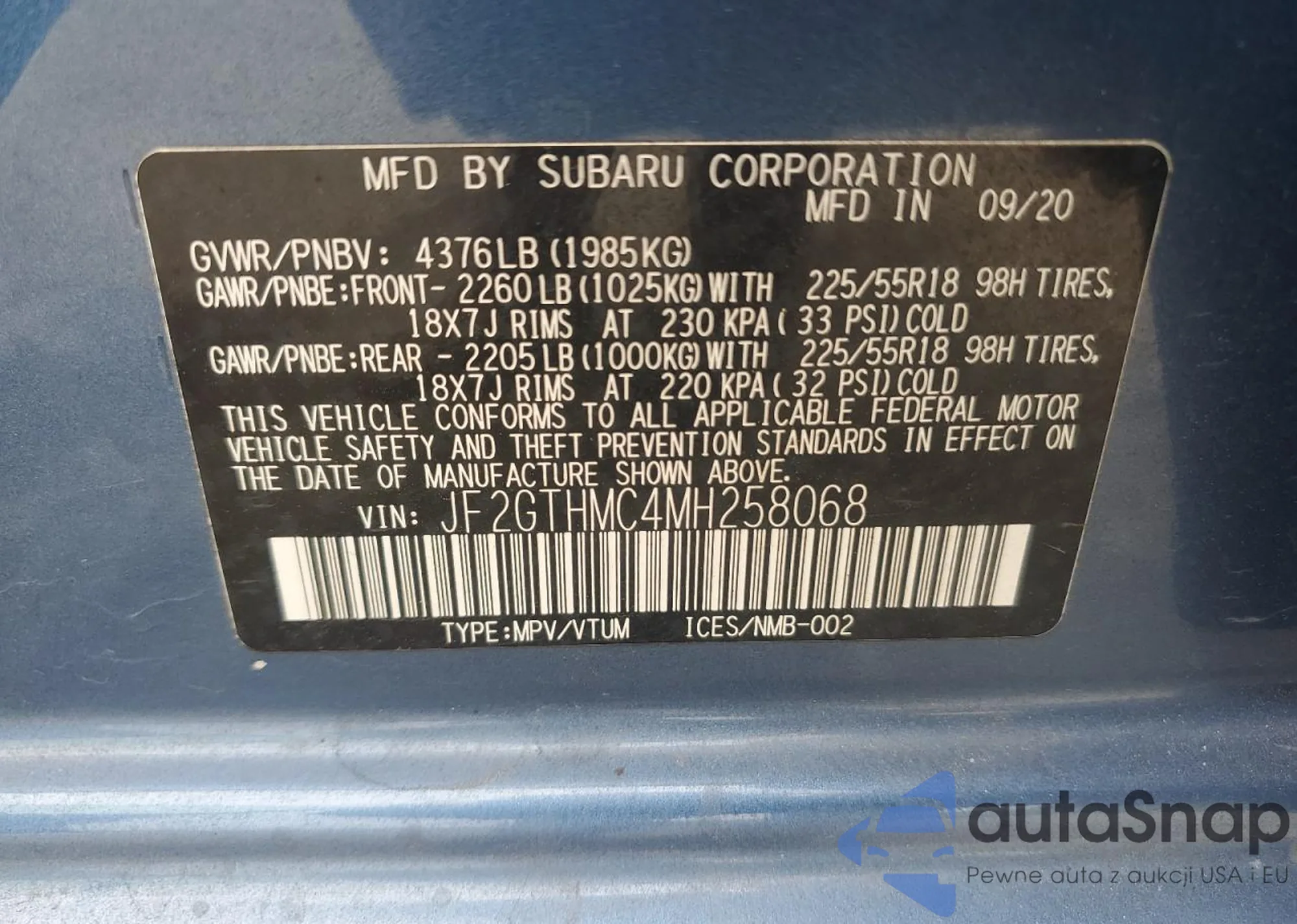 LOT: 81561845 VIN: JF2GTHMC4MH258068