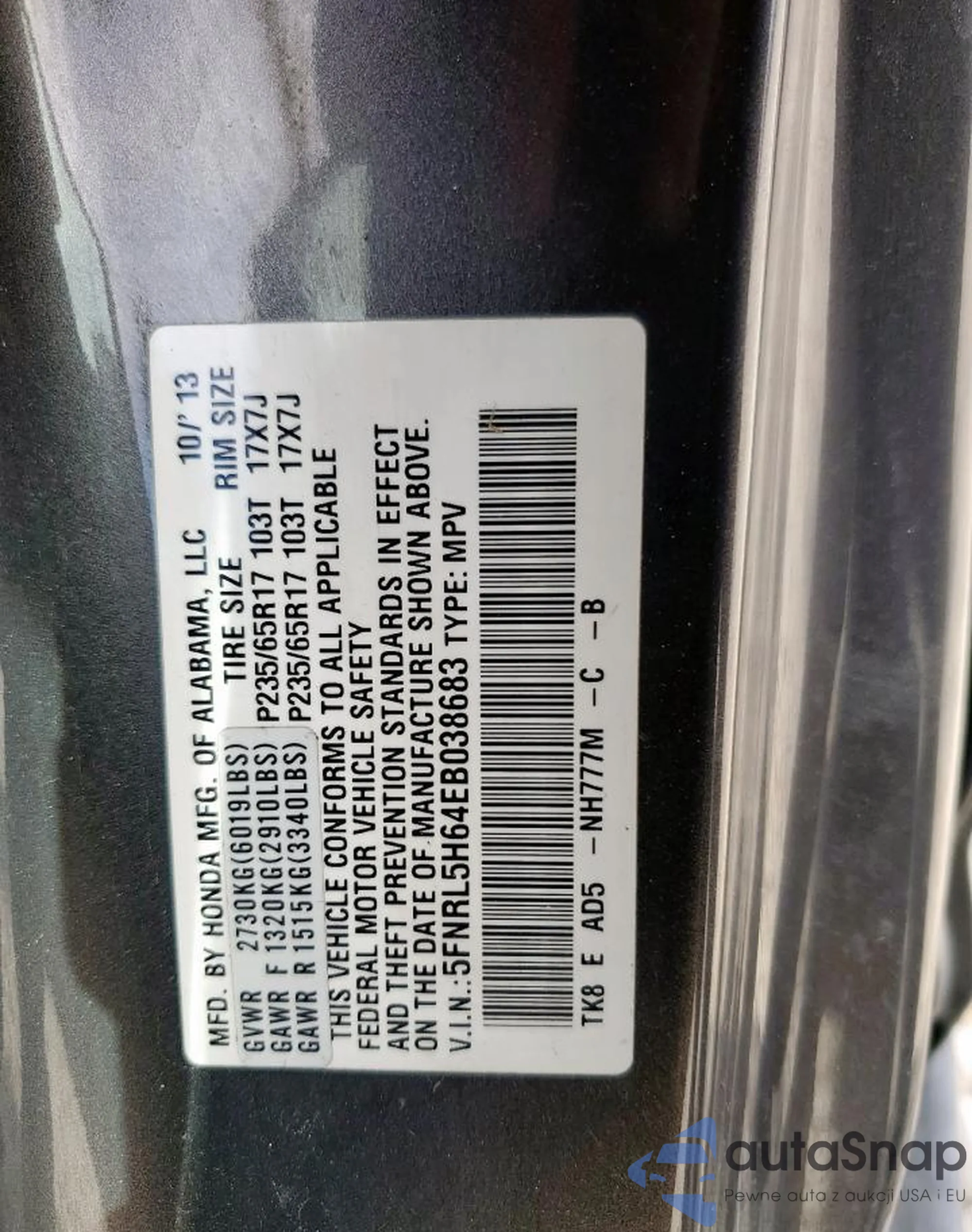 • VIN 5FNRL5H64EB038683