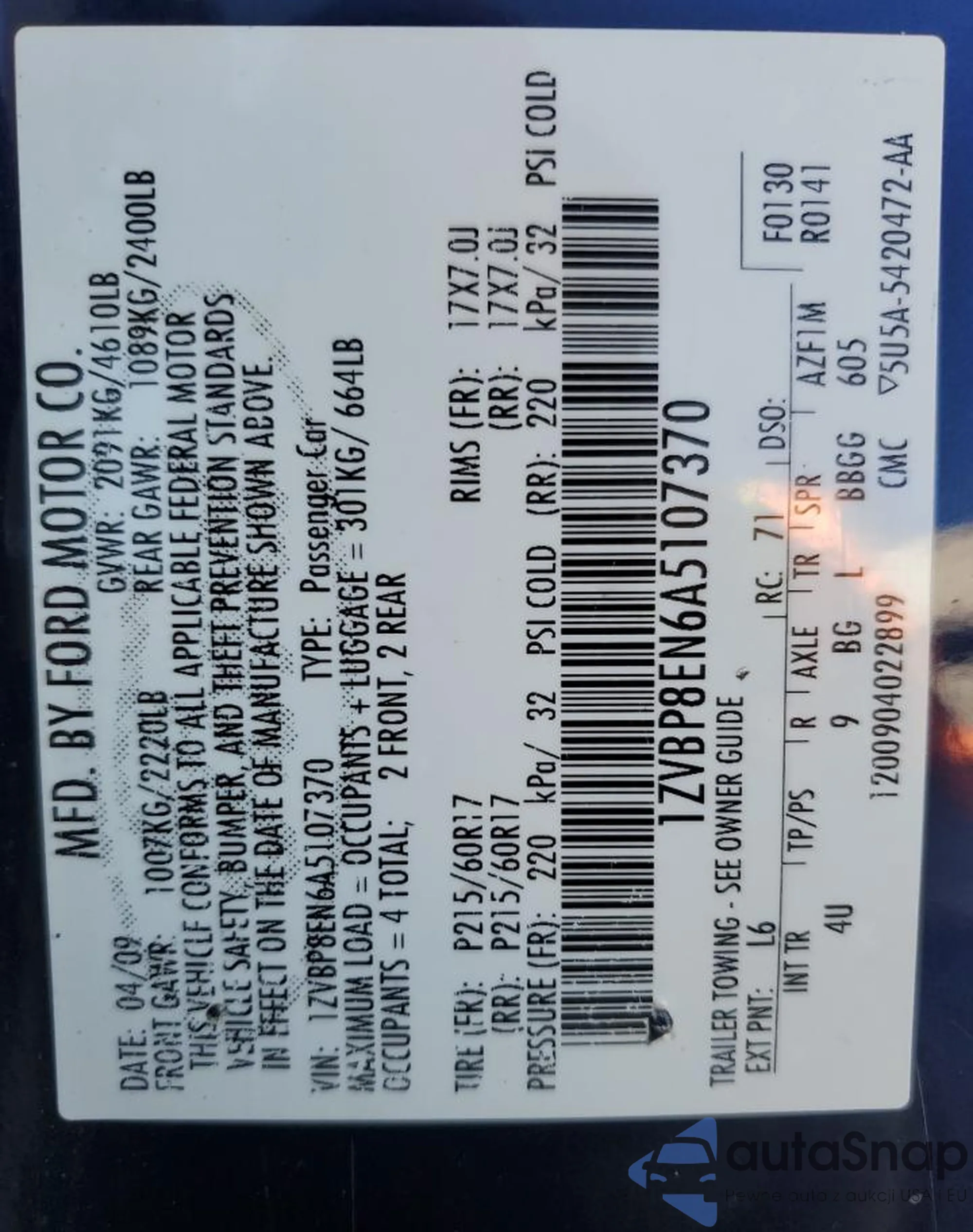 • VIN 1ZVBP8EN6A5107370