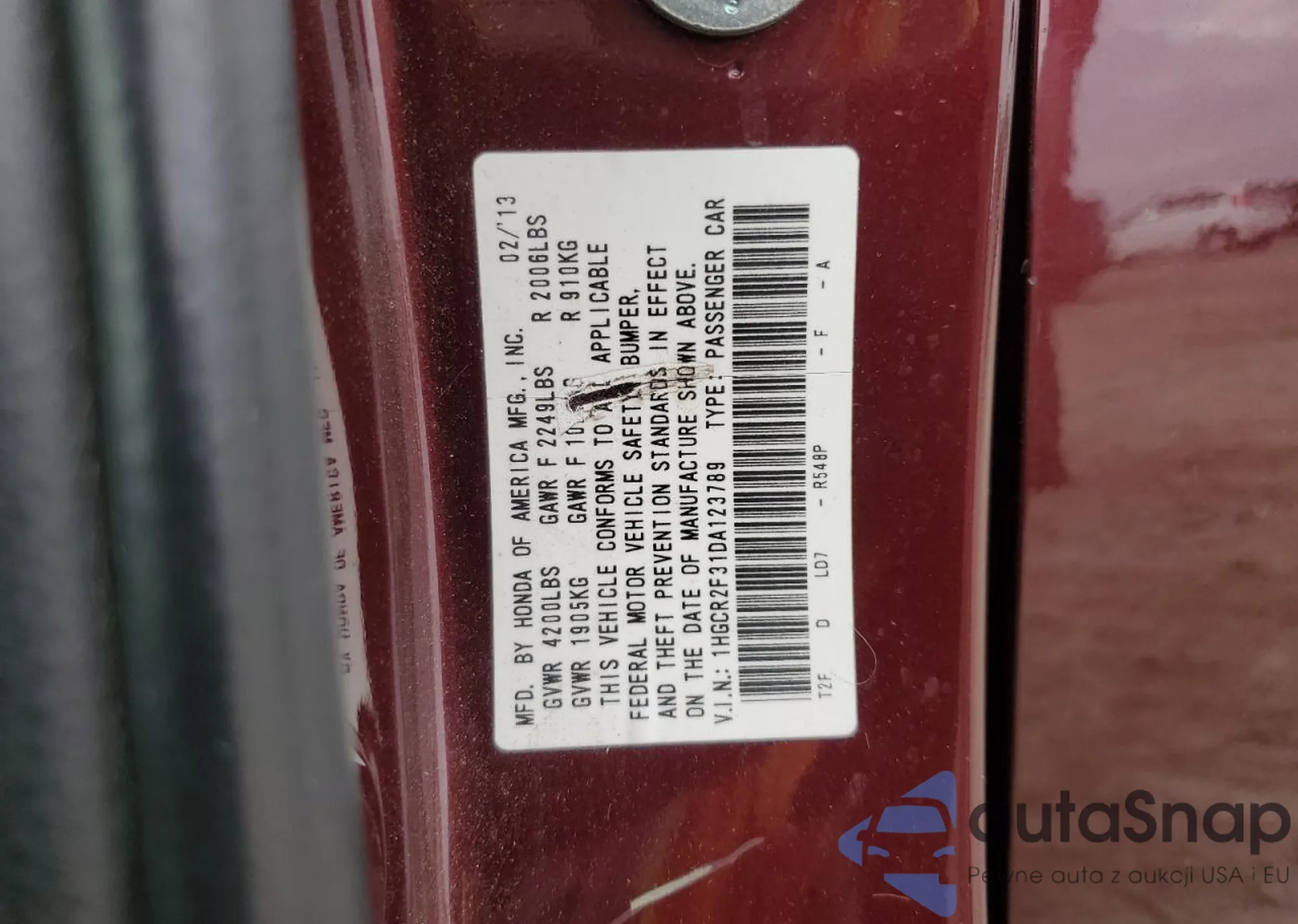 LOT: 81212765 VIN: 5FNYF4H5XDB073814