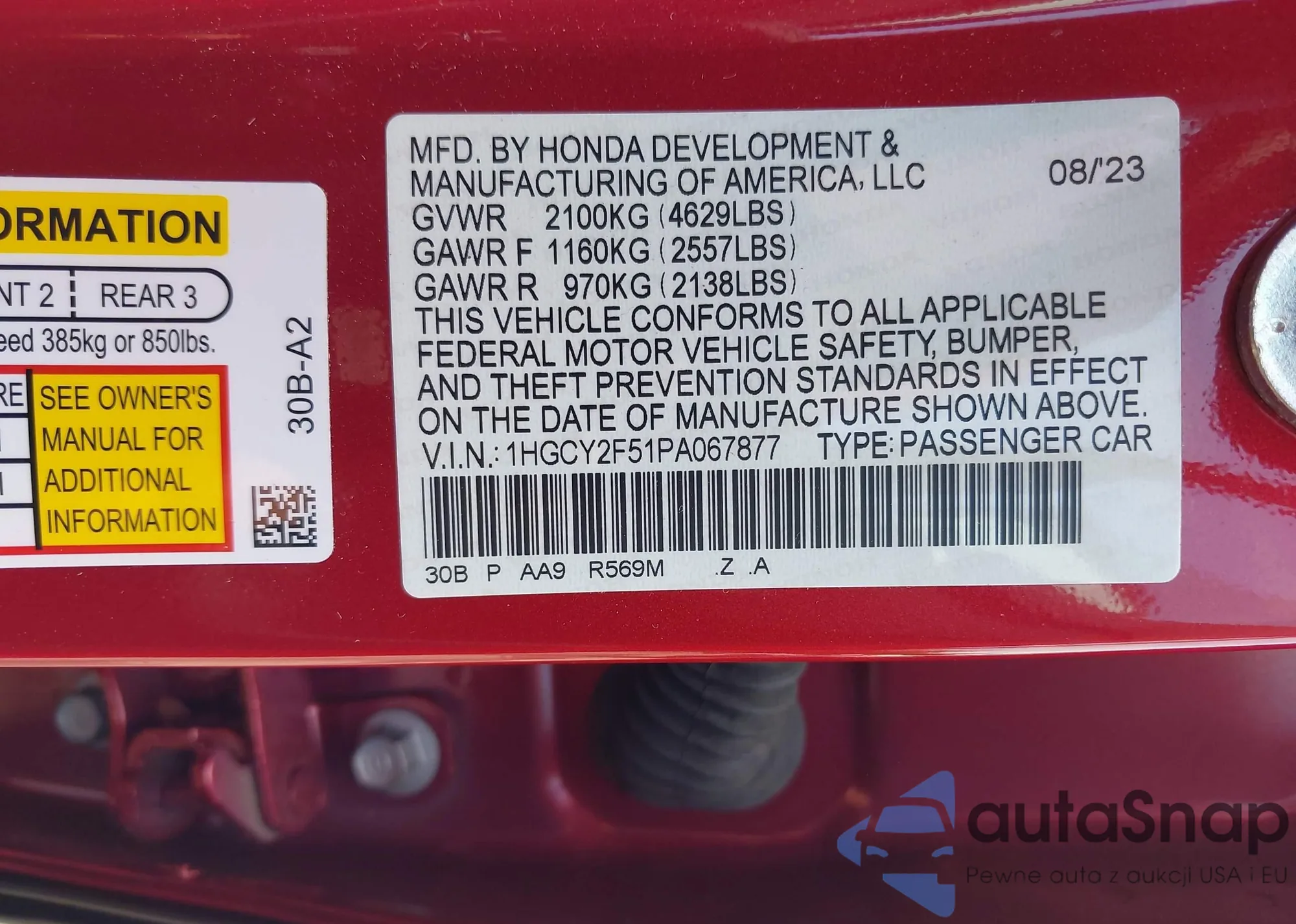 LOT: 42537086 VIN: 2HGFB2F58CH587486