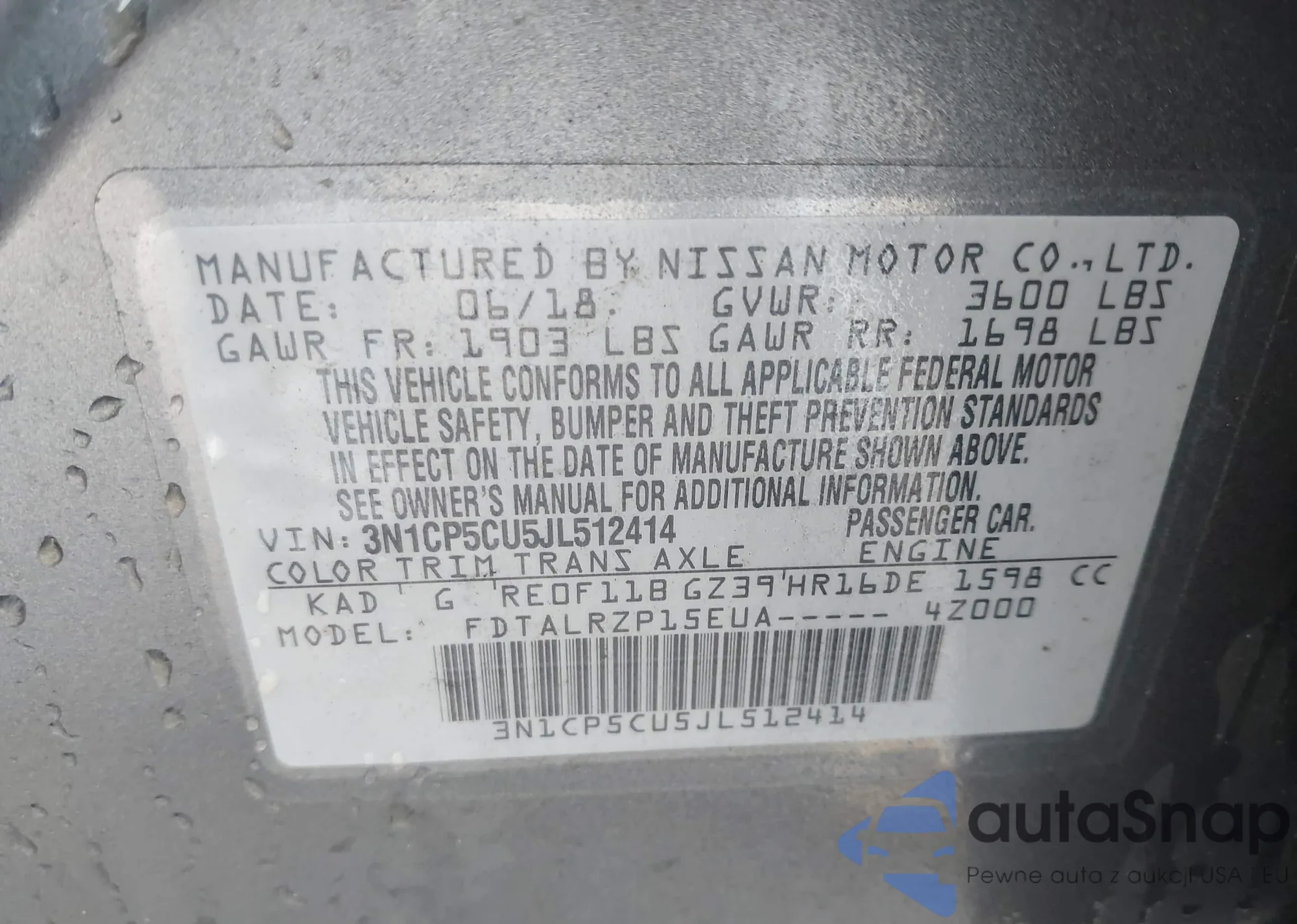 LOT: 42738896 VIN: 3N1CP5CU5JL512414