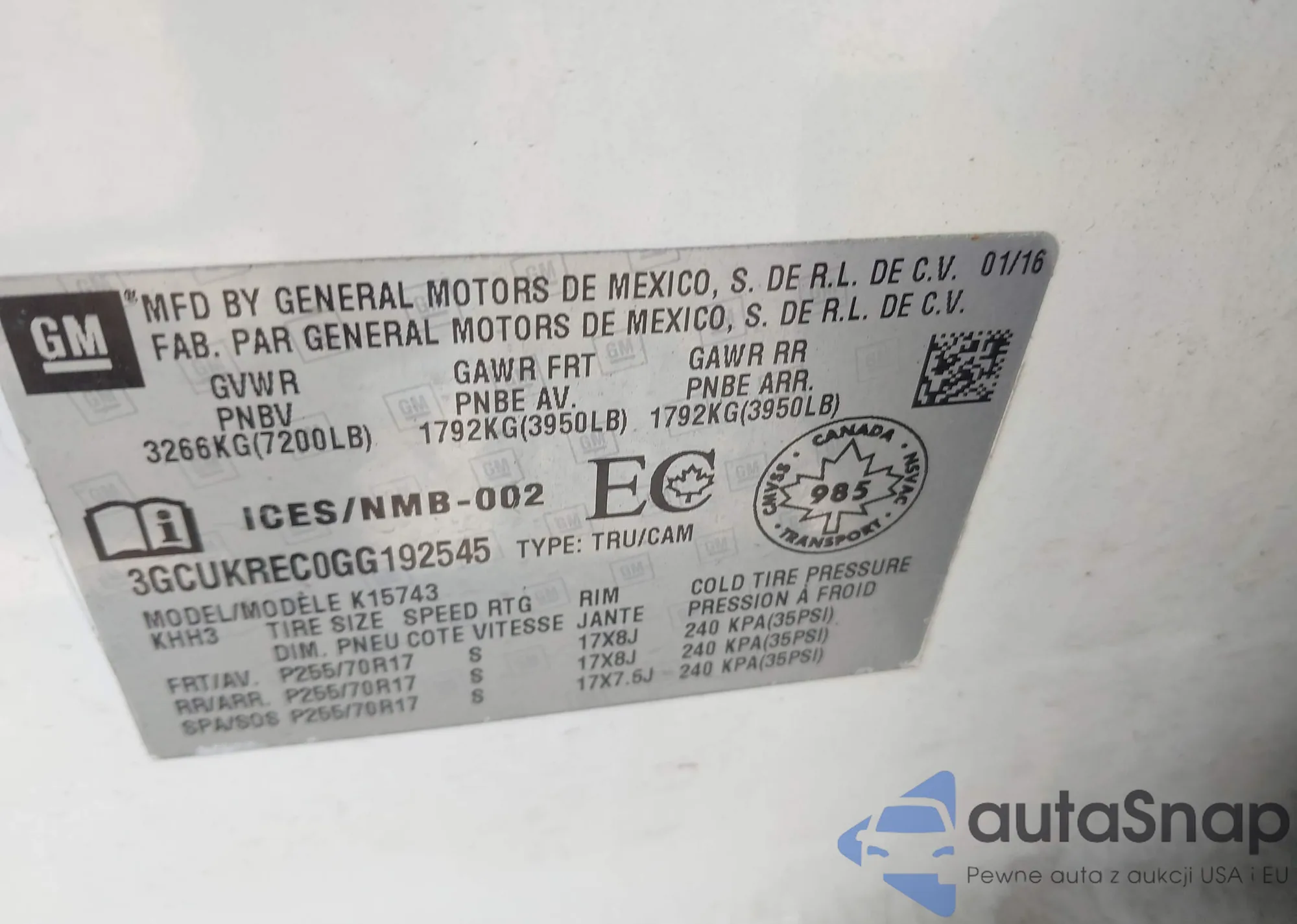 LOT: 43365659 VIN: 3GCUKREC0GG192545
