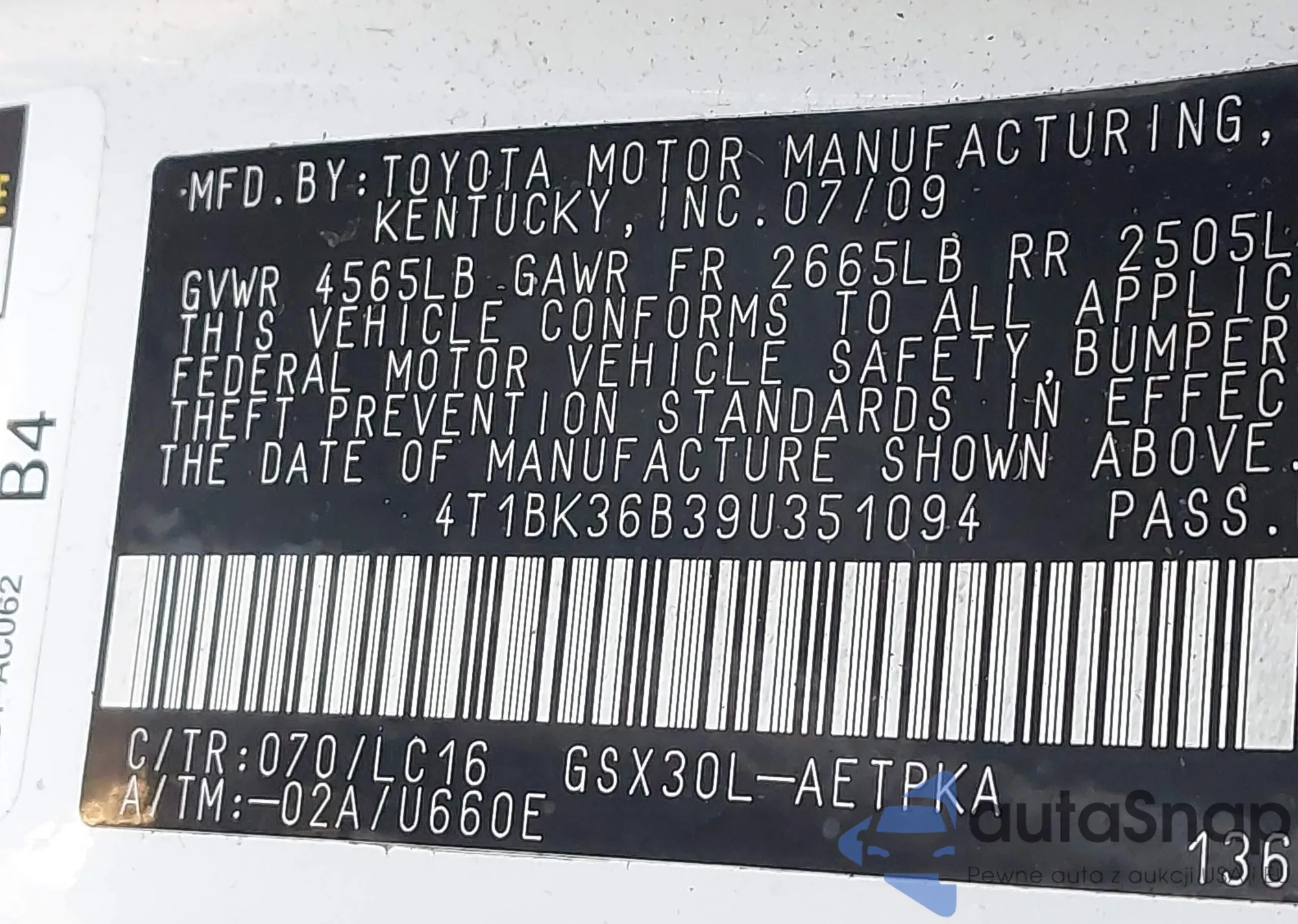 LOT: 43042075 VIN: 4T1BK36B39U351094