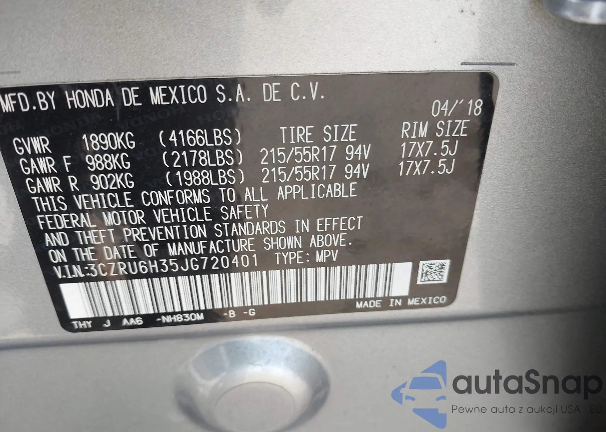 • VIN 3CZRU6H35JG720401
