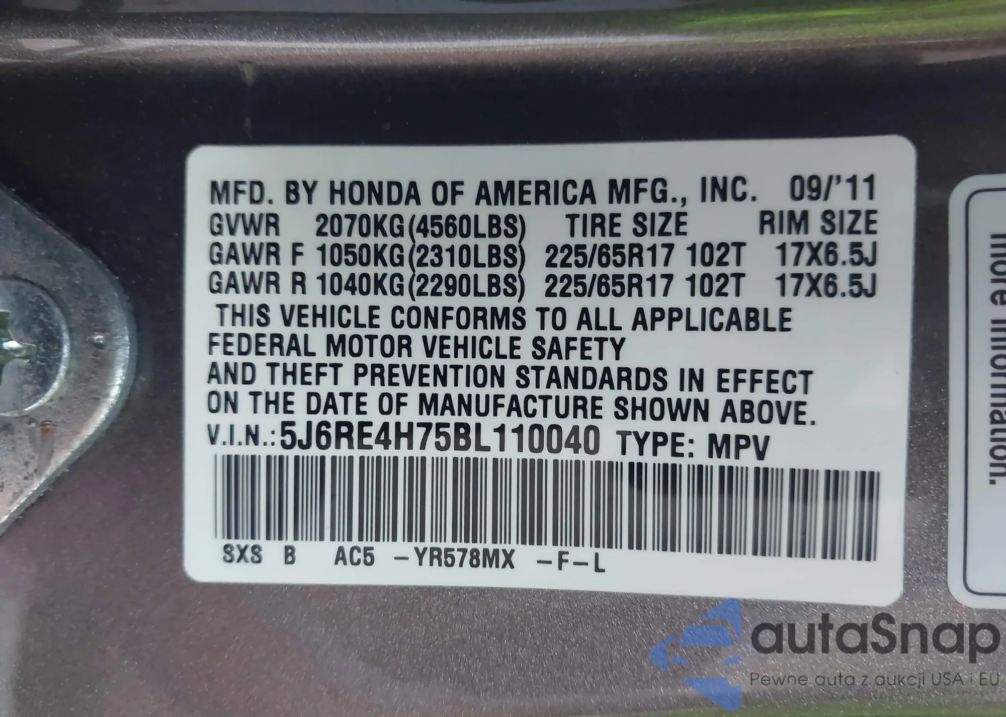• VIN 5J6RE4H75BL110040