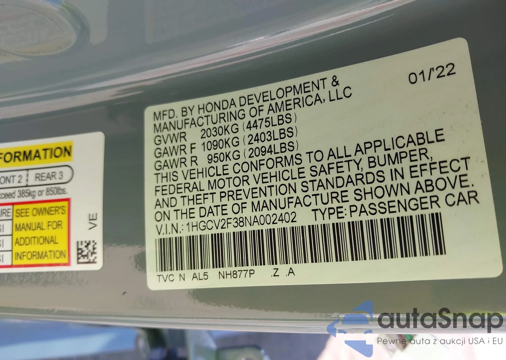 • VIN 1HGCV2F38NA002402