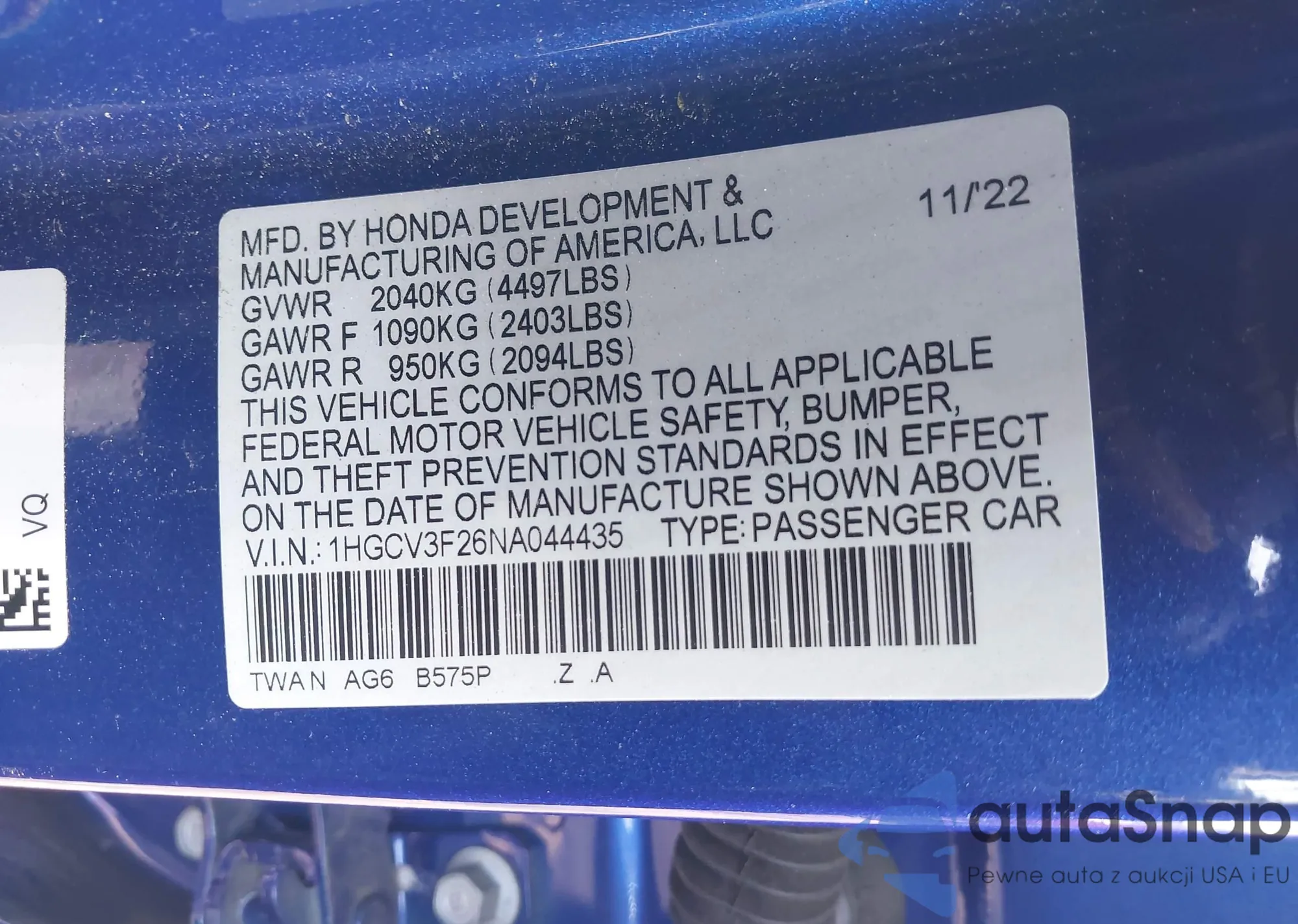 • VIN 1HGCV3F26NA044435