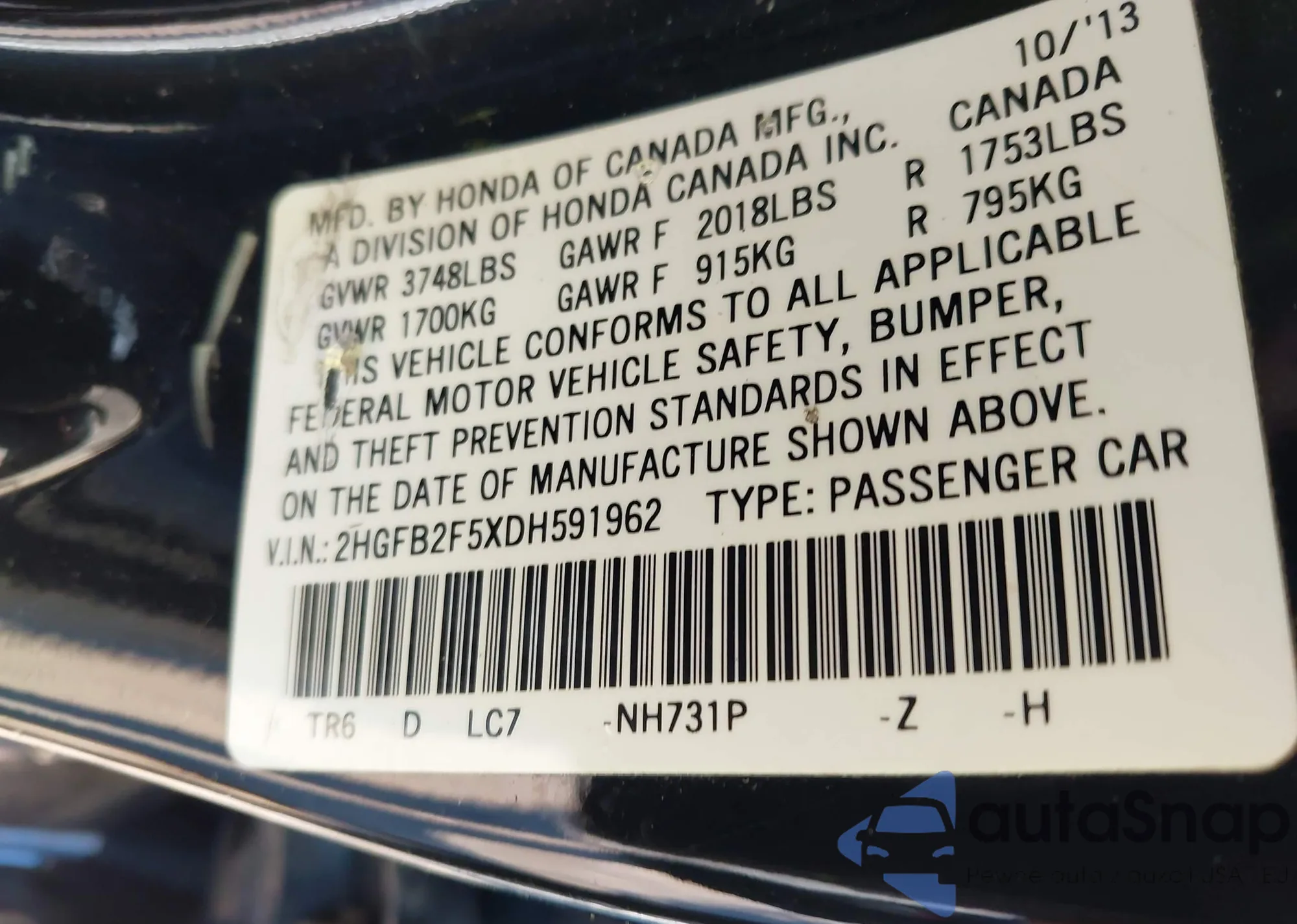 LOT: 43380095 VIN: 2HGFB2F5XDH591962