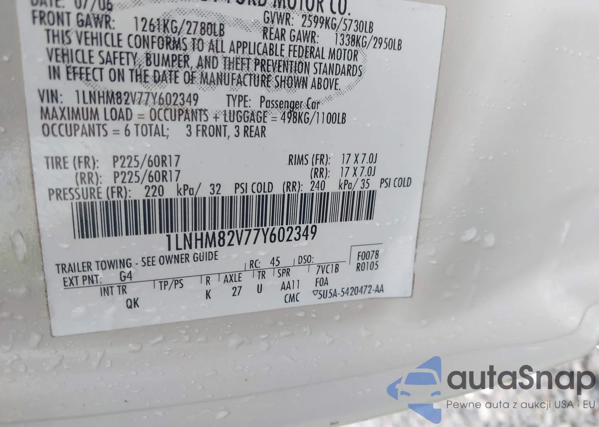 LOT: 42512556 VIN: 1LNHM82V77Y602349