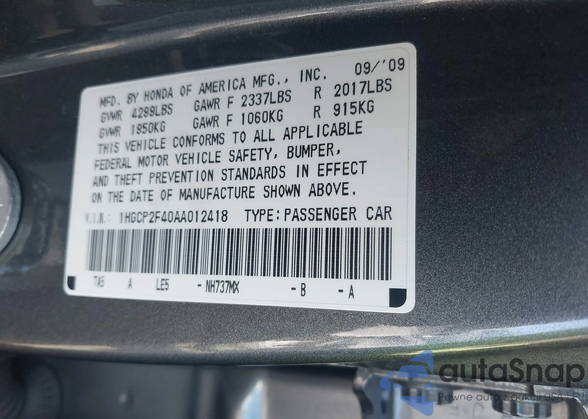 LOT: 43182491 VIN: 1HGCP2F40AA012418