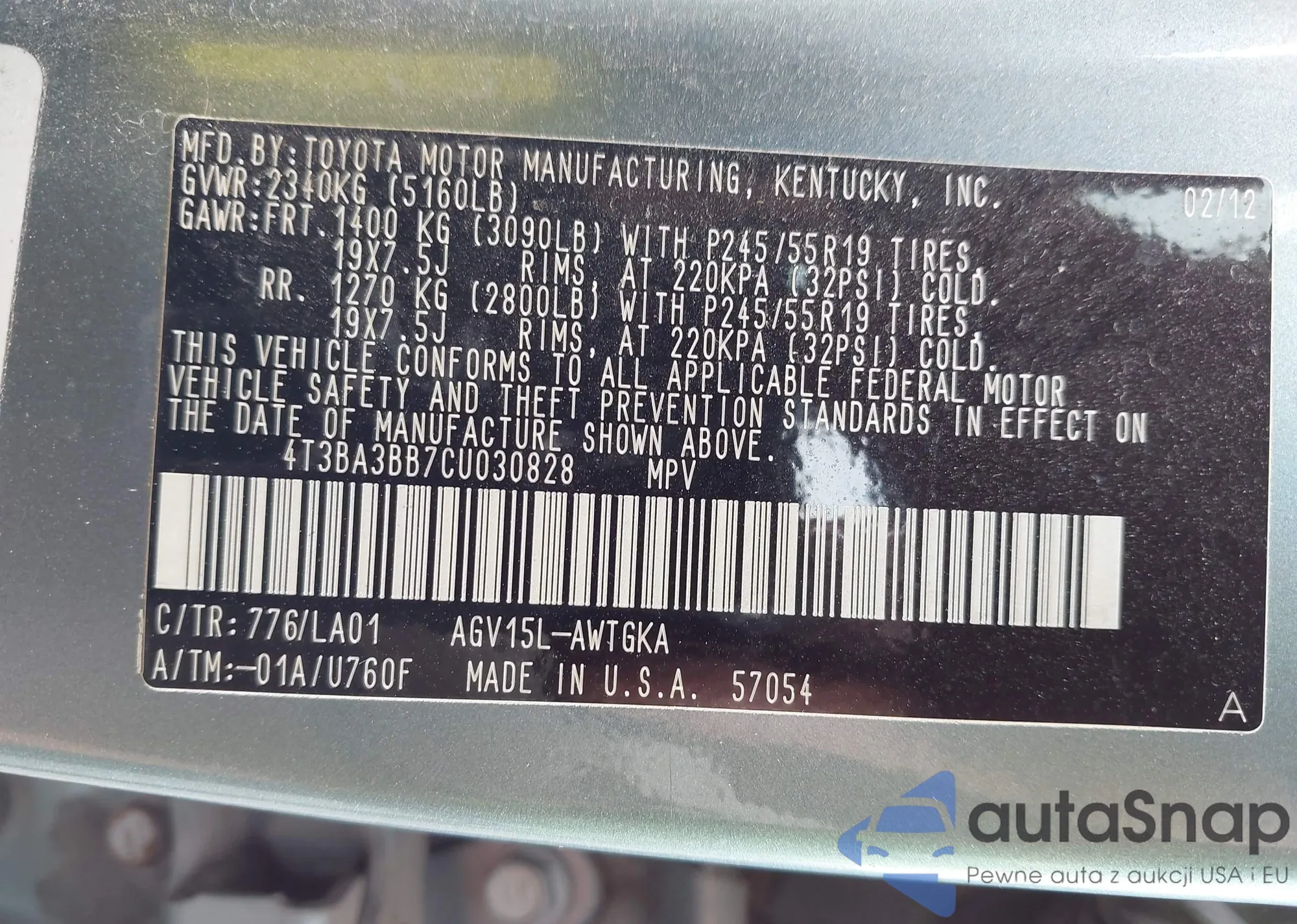 • VIN 4T3BA3BB7CU030828