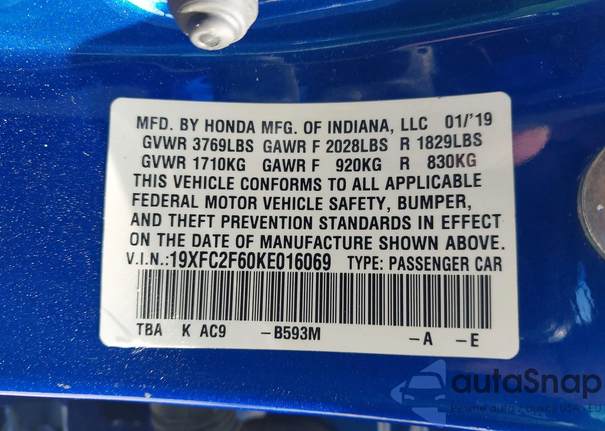 • VIN 4T1B11HK3KU216191