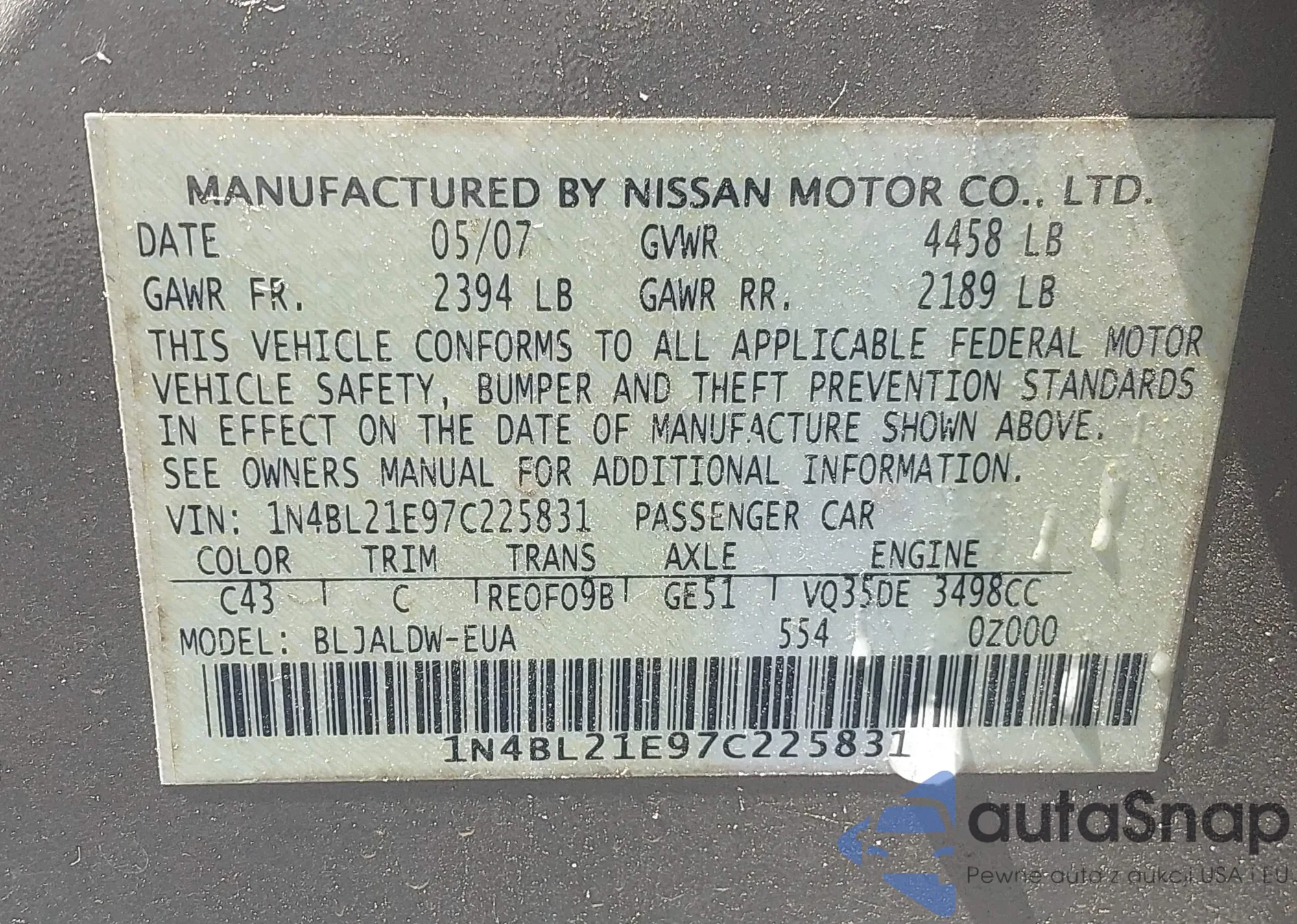LOT: 43147276 VIN: 1N4BL21E97C225831