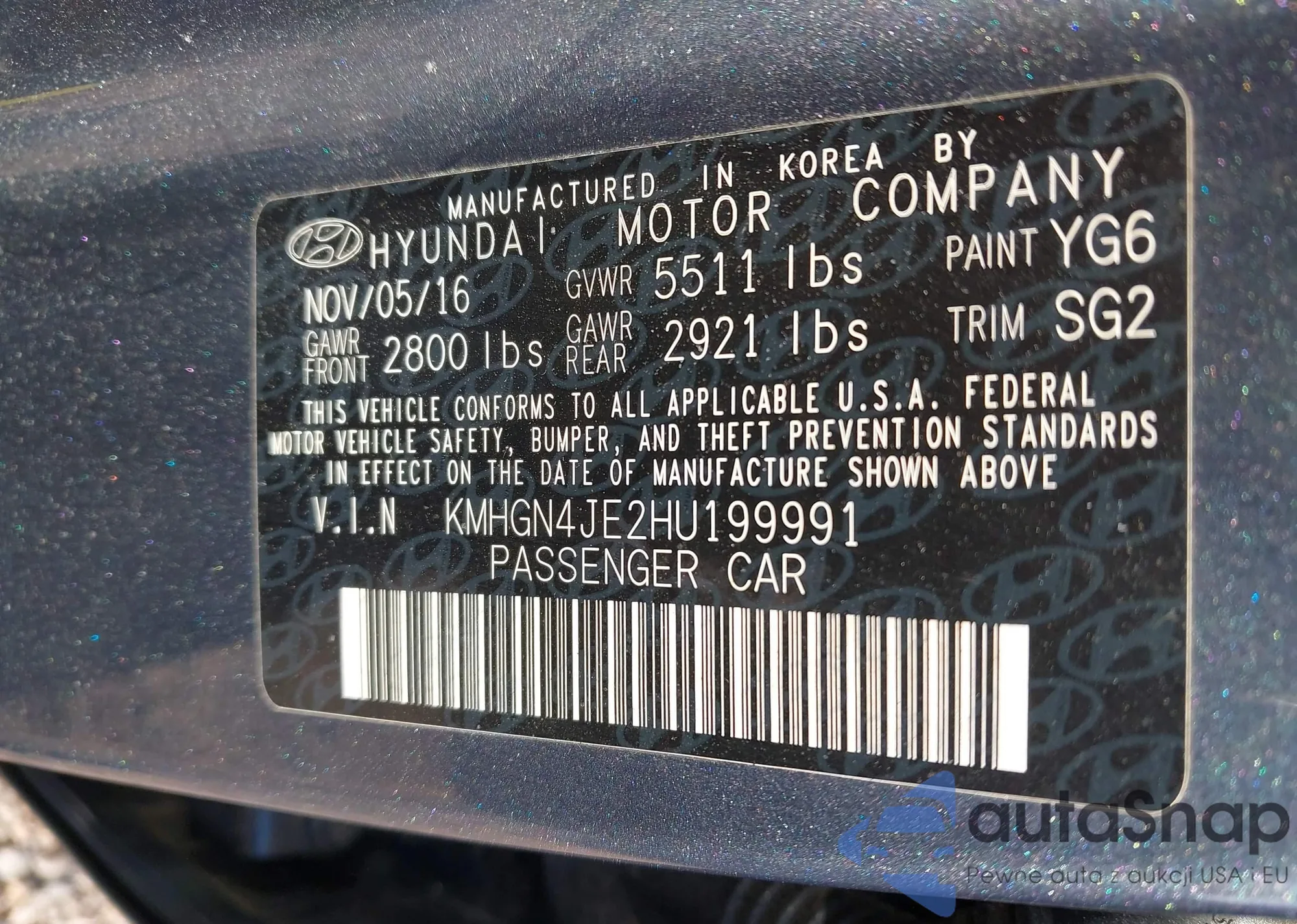 LOT: 43247368 VIN: KMHGN4JE2HU199991