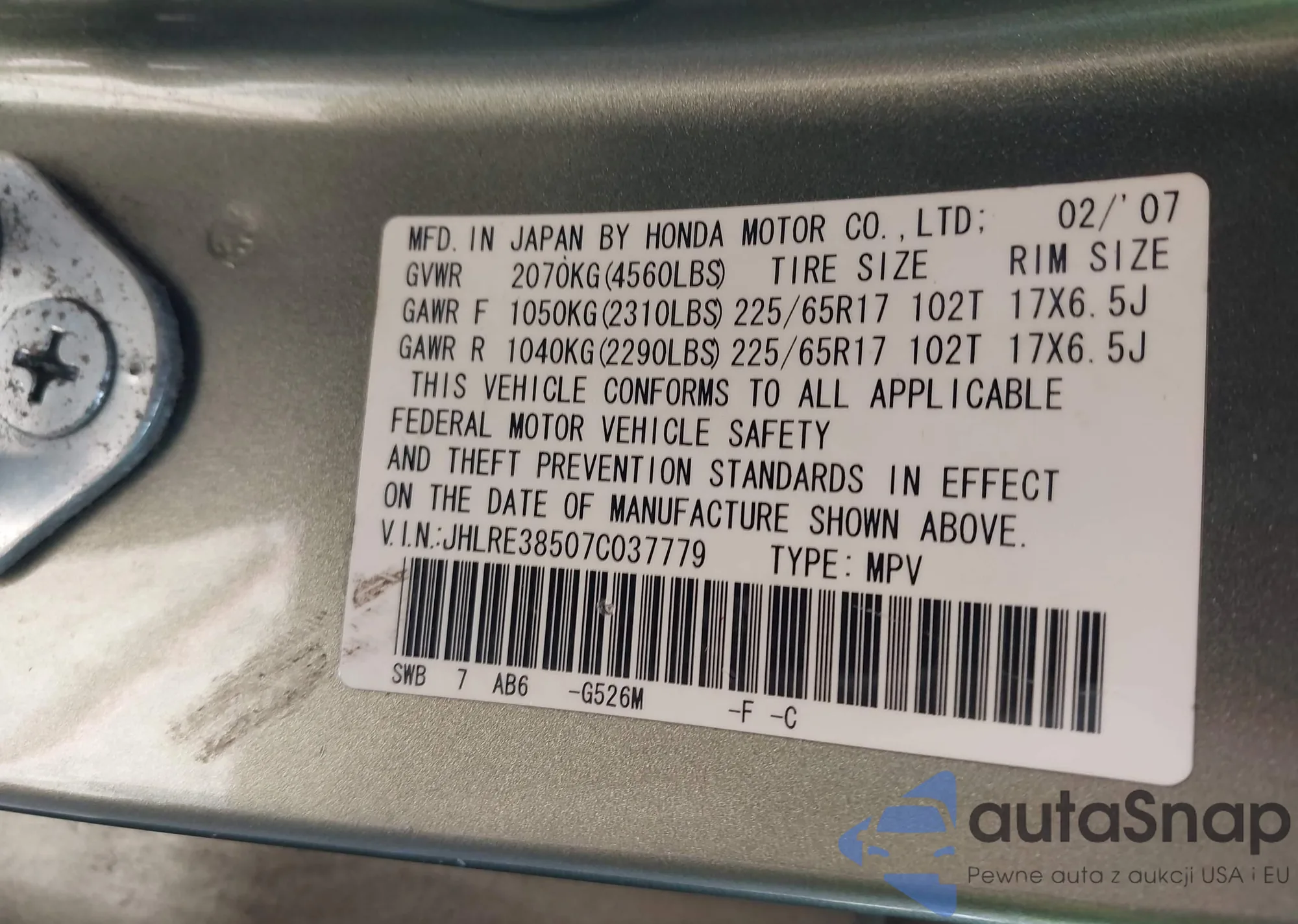 LOT: 43268520 VIN: JHLRE38507C037779
