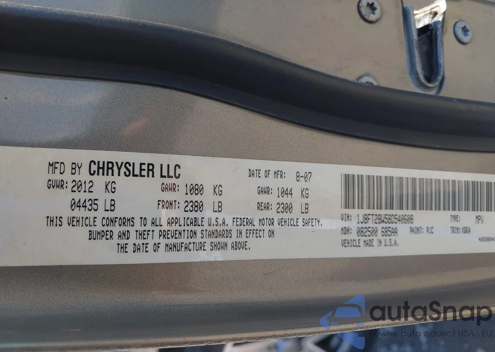 LOT: 43288425 VIN: 1J8FT28W58D540608