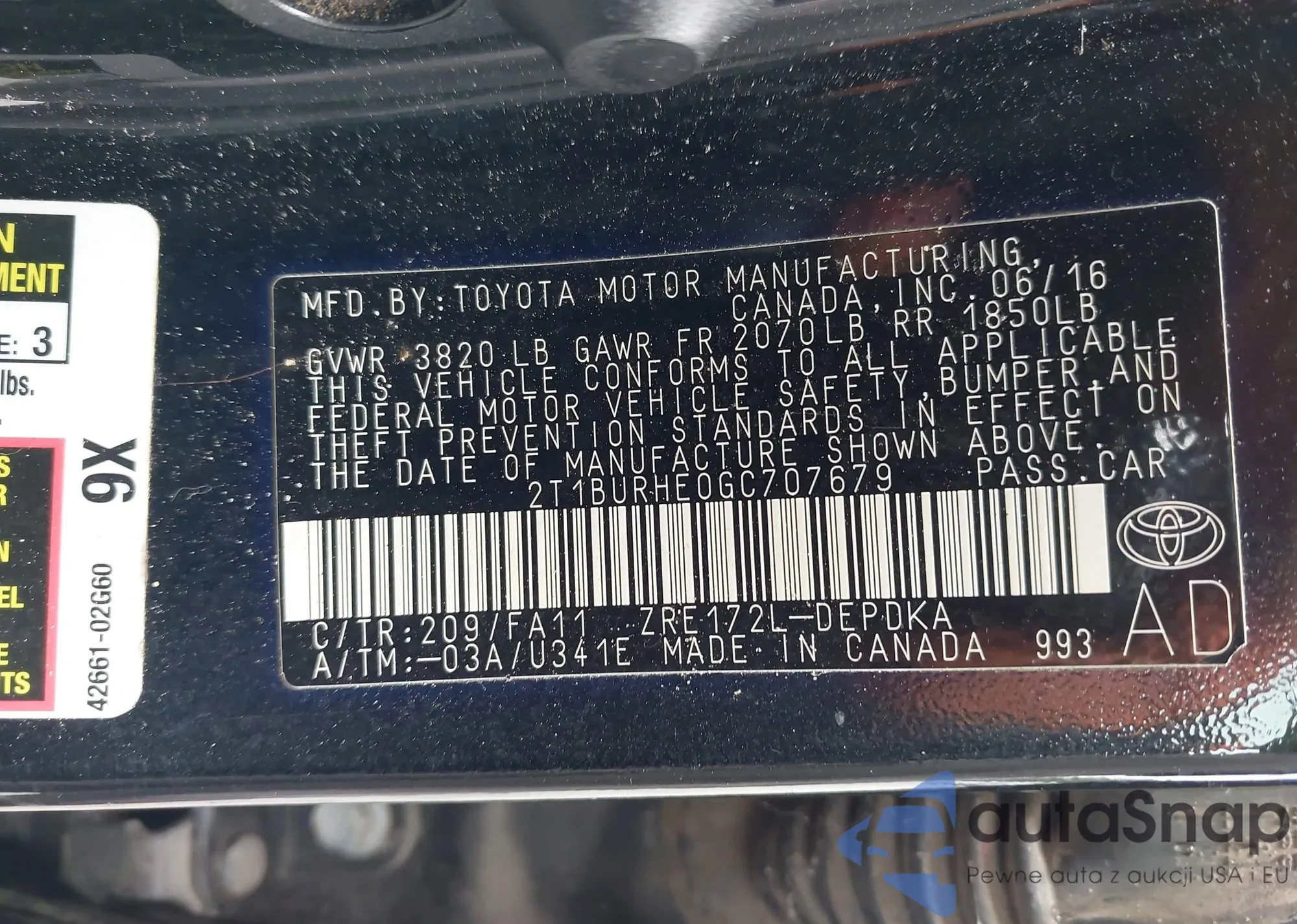 LOT: 43333601 VIN: 2T1BURHE0GC707679