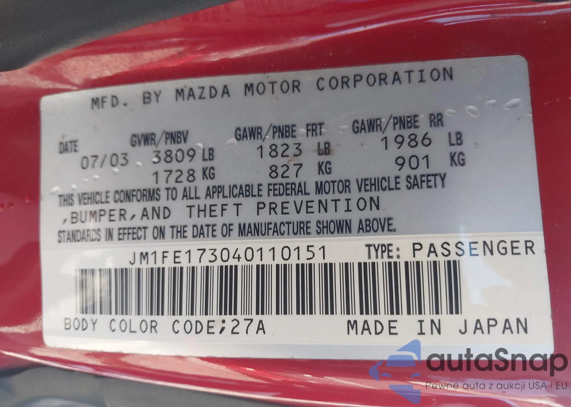 LOT: 43429086 VIN: JM1FE173040110151