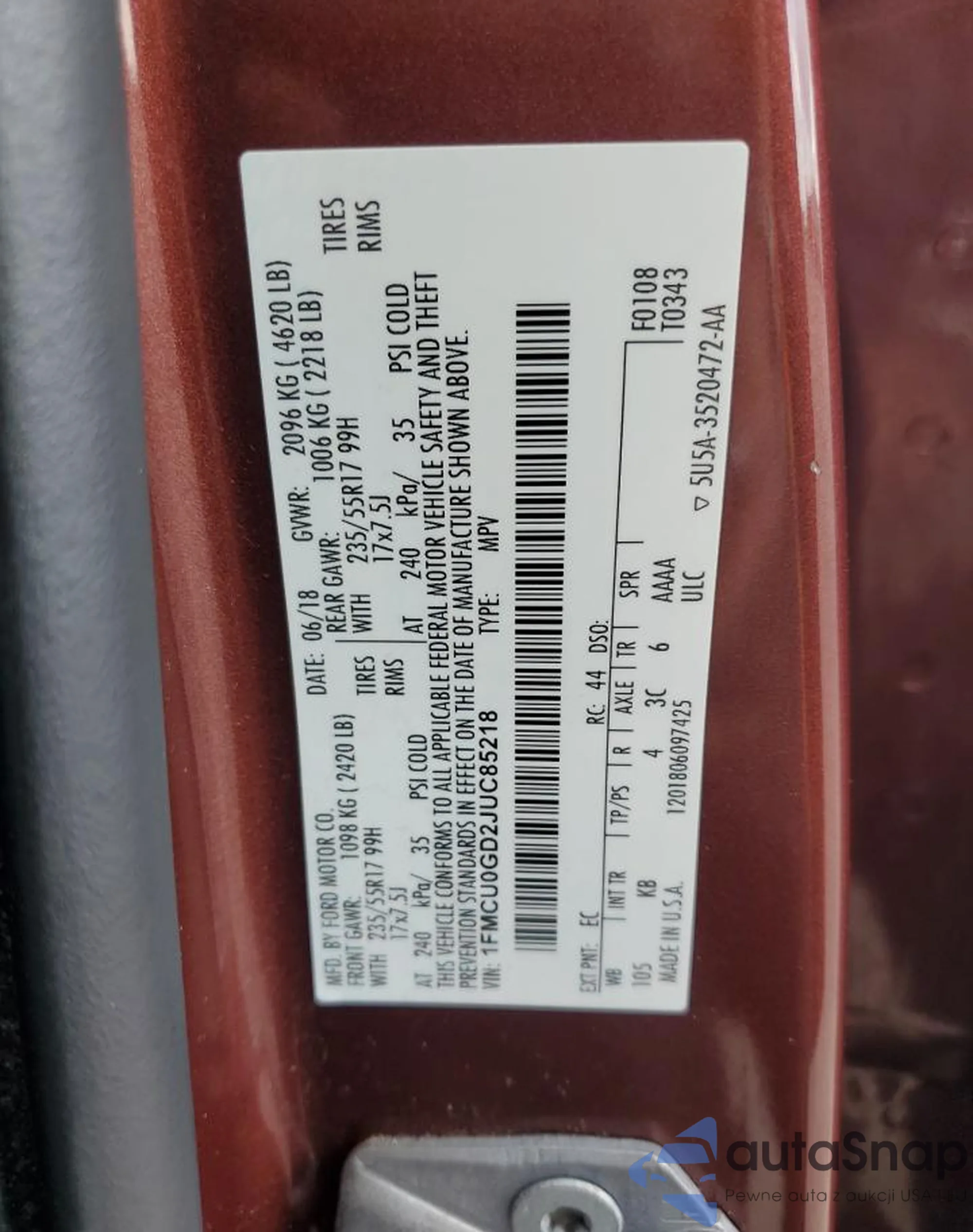 LOT: 80309435 VIN: 1FMCU0GD2JUC85218
