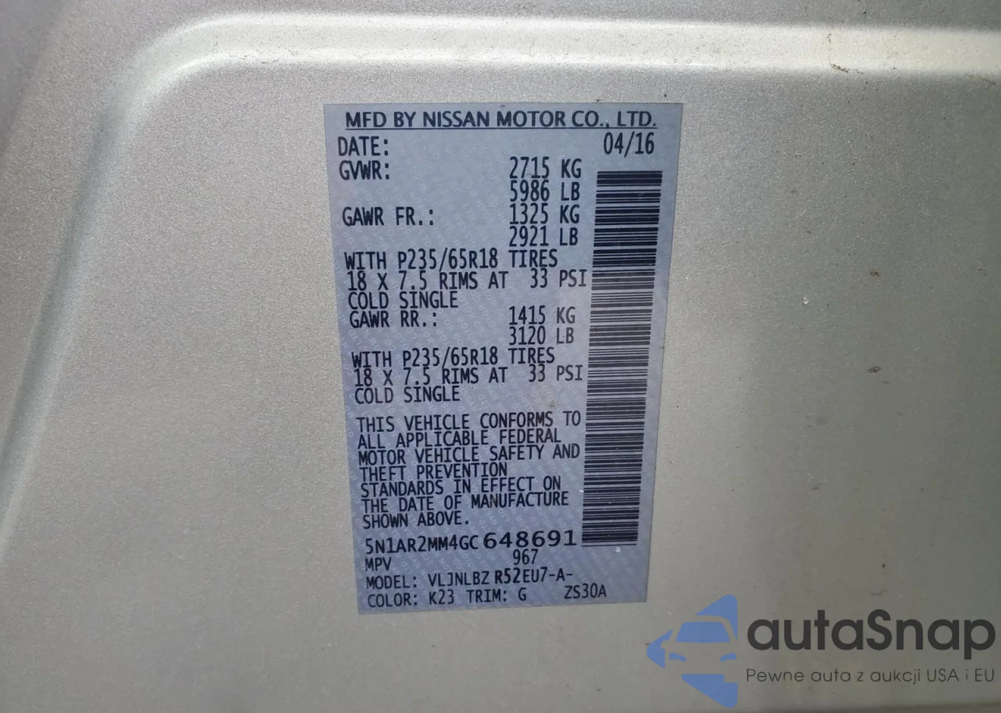 LOT: 87017045 VIN: 5N1AR2MM4GC64869