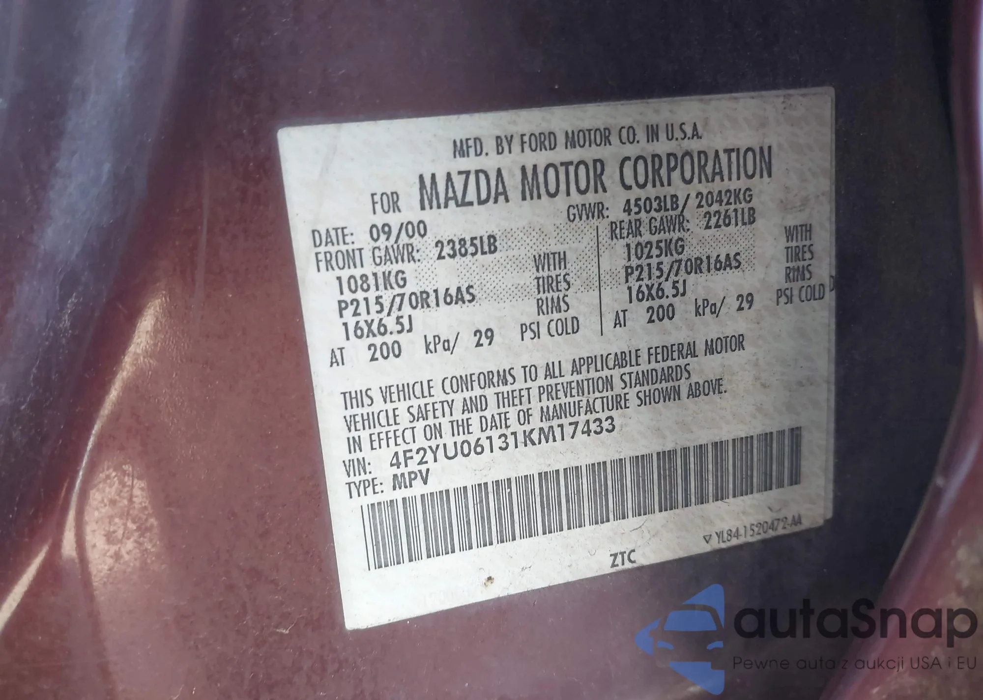 • VIN 4F2YU06131KM17433
