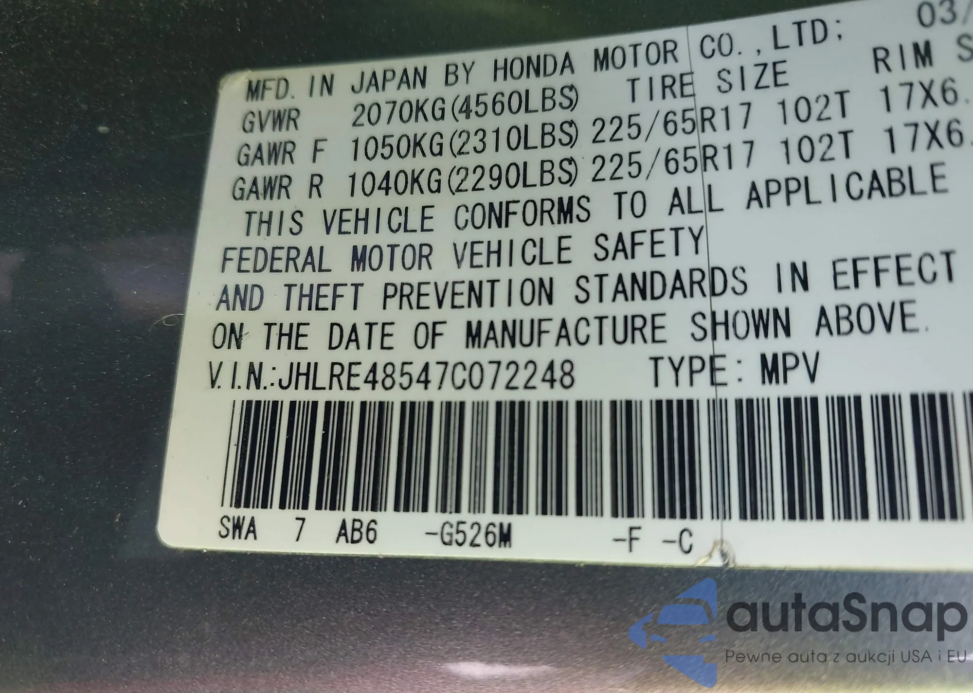 • VIN JHLRE48547C072248