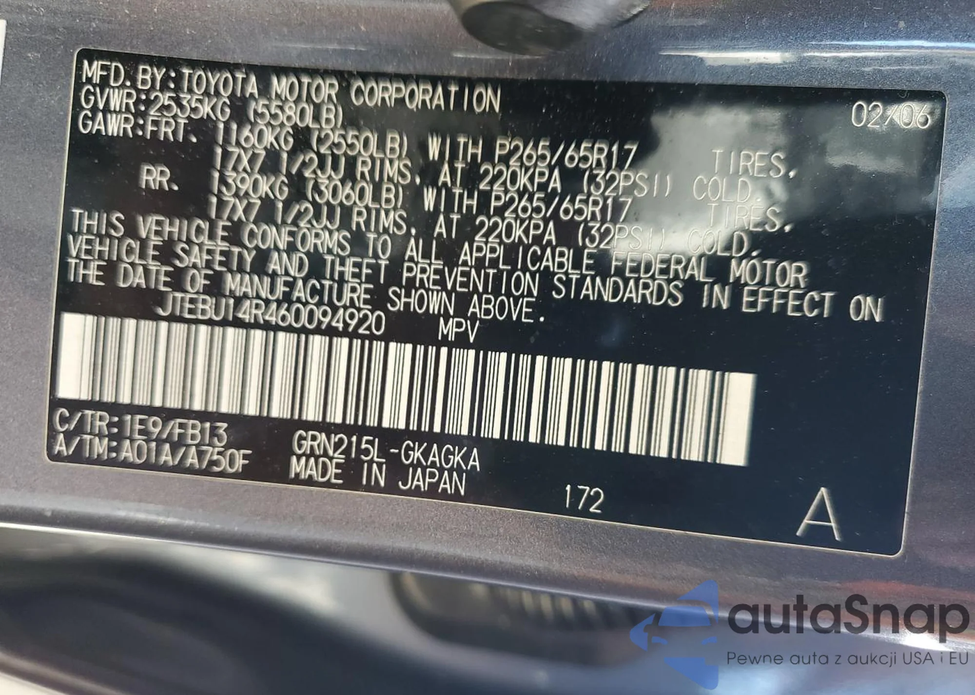 LOT: 86893875 VIN: JTEBU14R460094920
