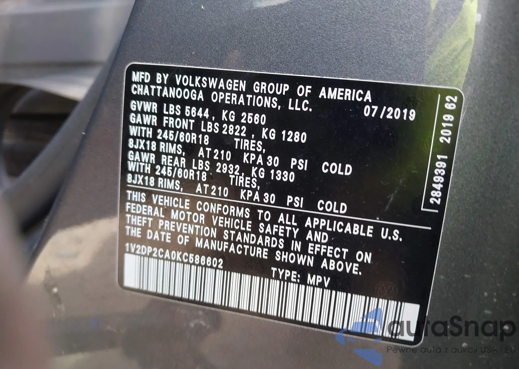 LOT: 43141888 VIN: 1V2DP2CA0KC586602