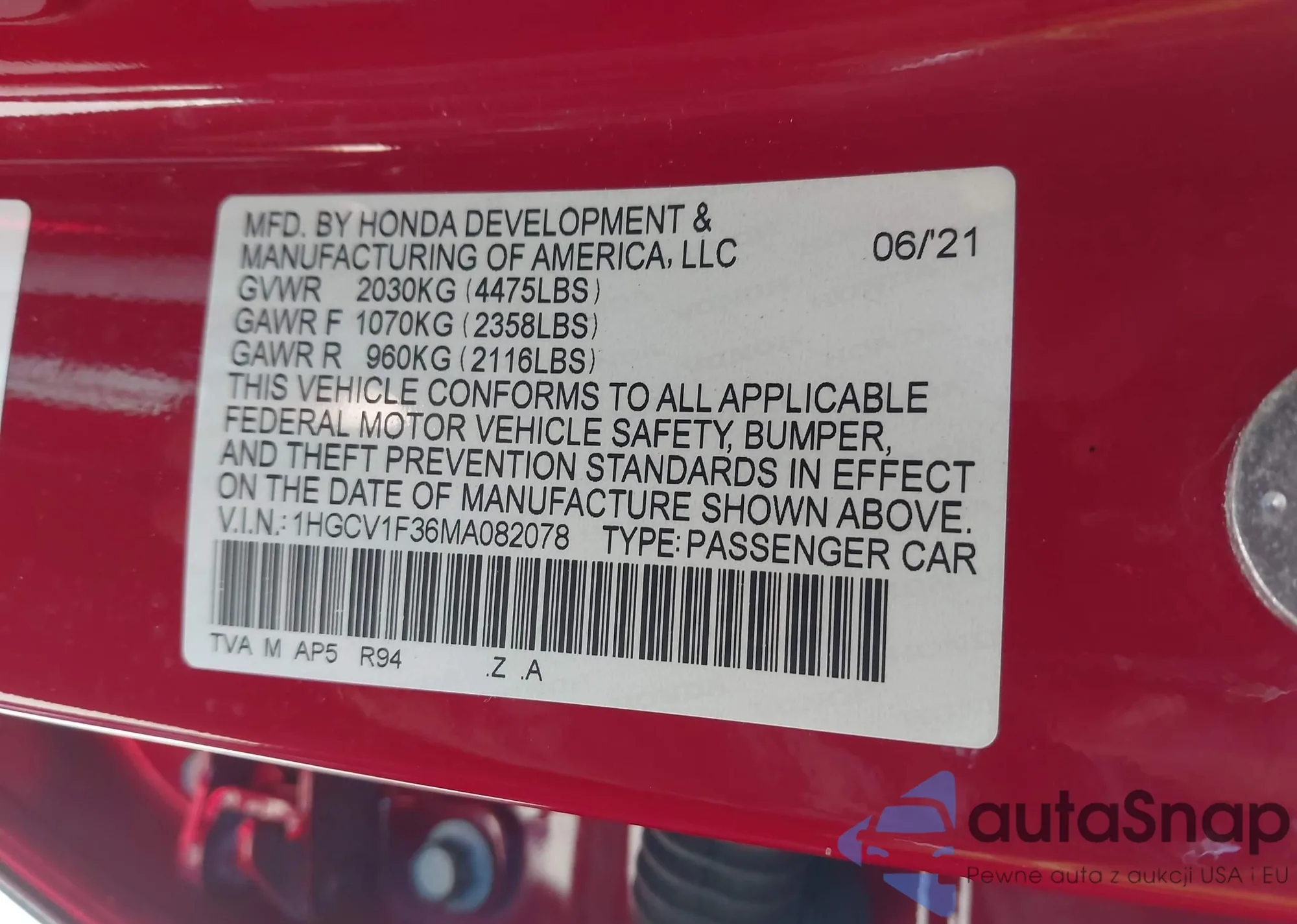 LOT: 43133307 VIN: 1HGCV1F36MA082078