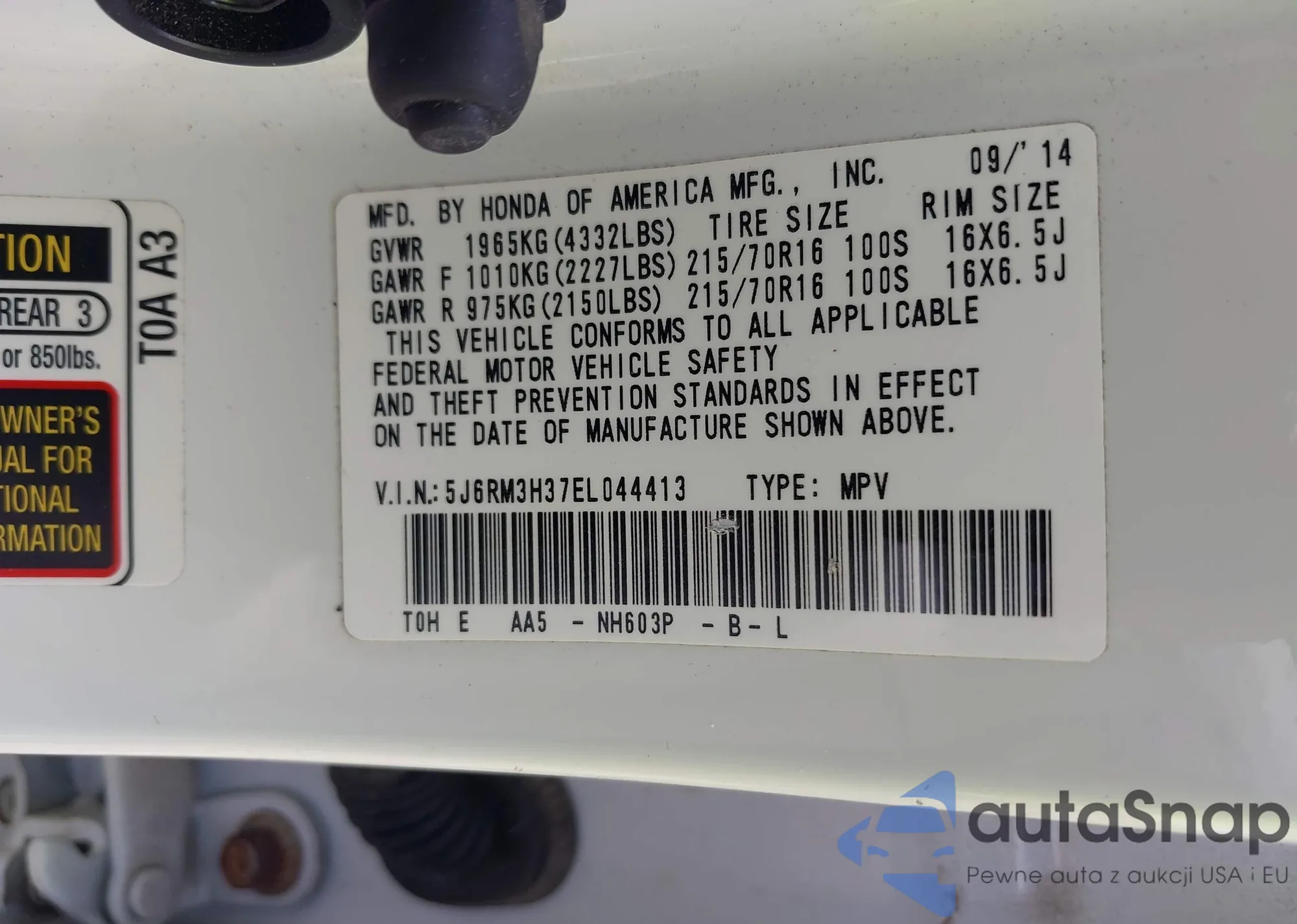 • VIN 5J6RM3H37EL044413