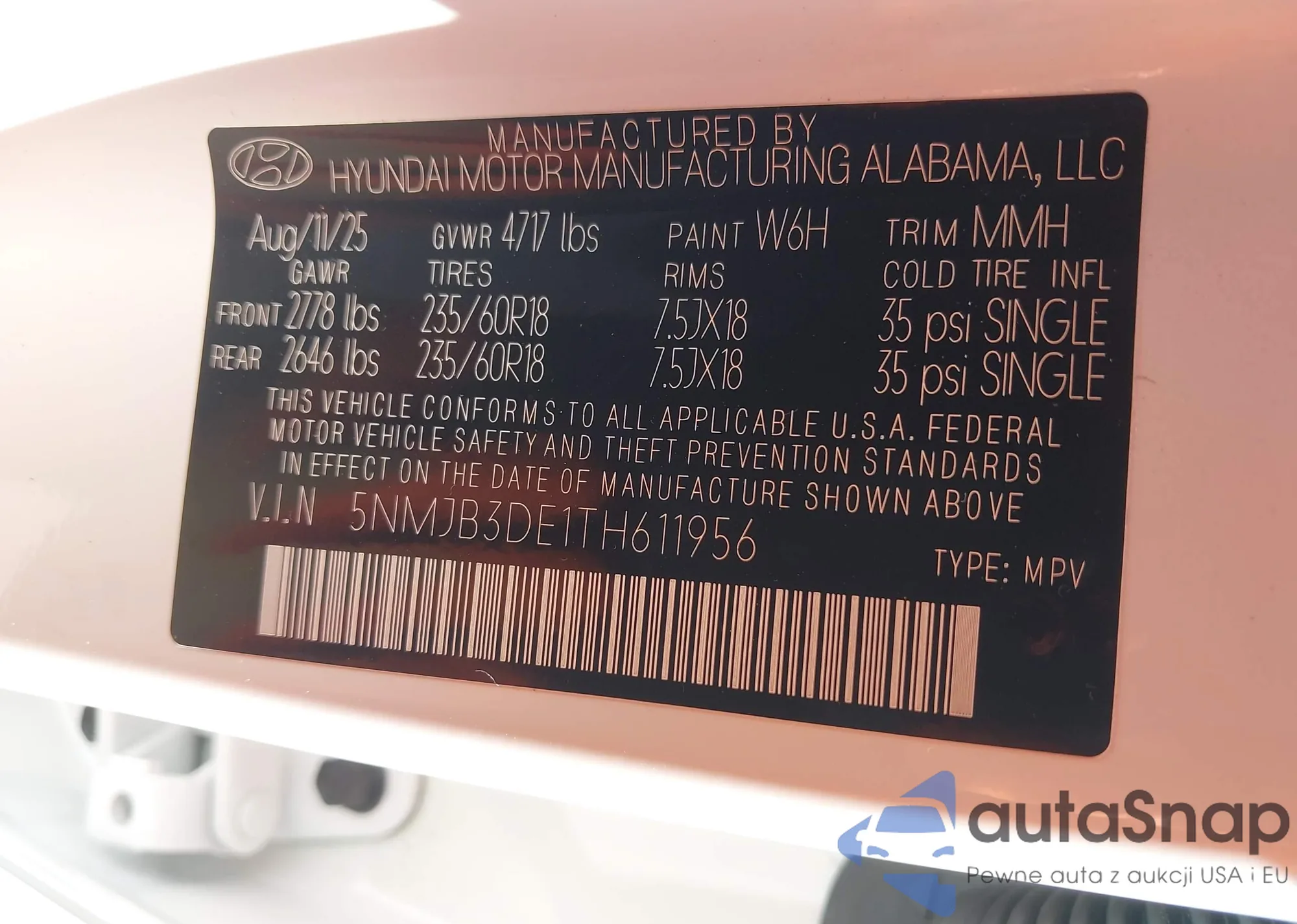 • VIN 5NMJB3DE1TH611956